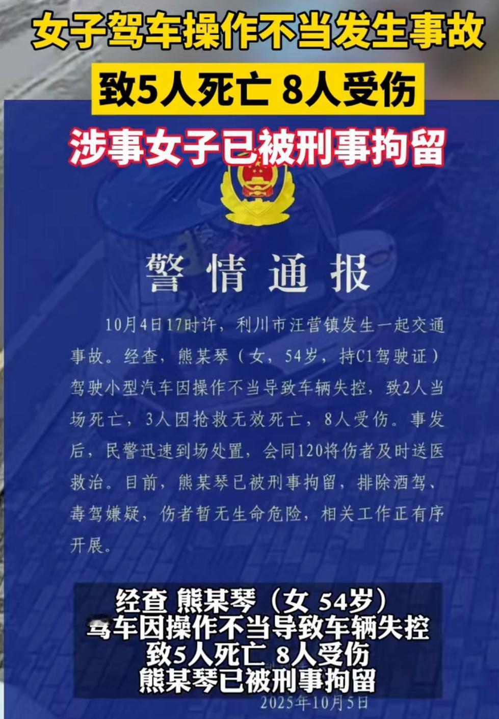 湖北利川的那起交通事故,54岁女子因驾驶汽车操作不当致5死8伤,当前已被刑事拘留。 网友又扒出多个细节,事故发生时女子驾驶车辆为避让前方横穿马路的行人时,导致车辆失控驶入非机动车道。 涉事女子持C1证,驾龄超过8年,非新手司机,开的是其儿媳的油车,江苏牌照,车尾贴有实习标志。 当时由于她太紧张了,本想踩刹车却误踩了油门,方向盘也打反了,车辆急速撞到了3名行人、4 辆非机动,最终撞在路边的树干上才停下。 本来国庆中秋团圆的时刻,却因飞来横祸,几个家庭陷入悲痛。道路千万条,安全第一条,驾驶技术不行,就等练好了再上路,手握方向盘上路,一定要秉承着敬畏之心,愿逝者安息! 湖北利川交通事故 湖北利川突发5死8伤交通事故 你对“马路杀手”现象有什么看法?