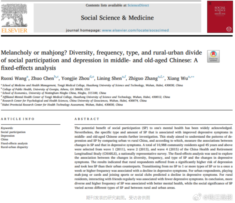 日前,由宁波诺丁汉大学健康经济学首席教授陈茁与华中科技大学学者合作的一项研究《忧郁还是麻将?中国中老年人社会参与的多样性、频率、类型及城乡差异与抑郁的关系:固定效应分析》引起社会关注。
