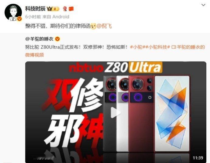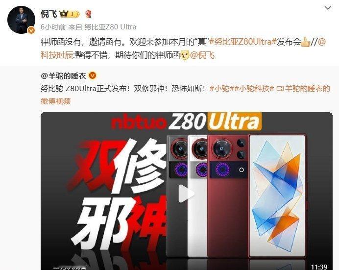 倪飞在微博回应了此次的事件,并直接表示“律师函没有,邀请函有。欢迎来参加本月的“真”努比亚 Z80 Ultra 发布会。