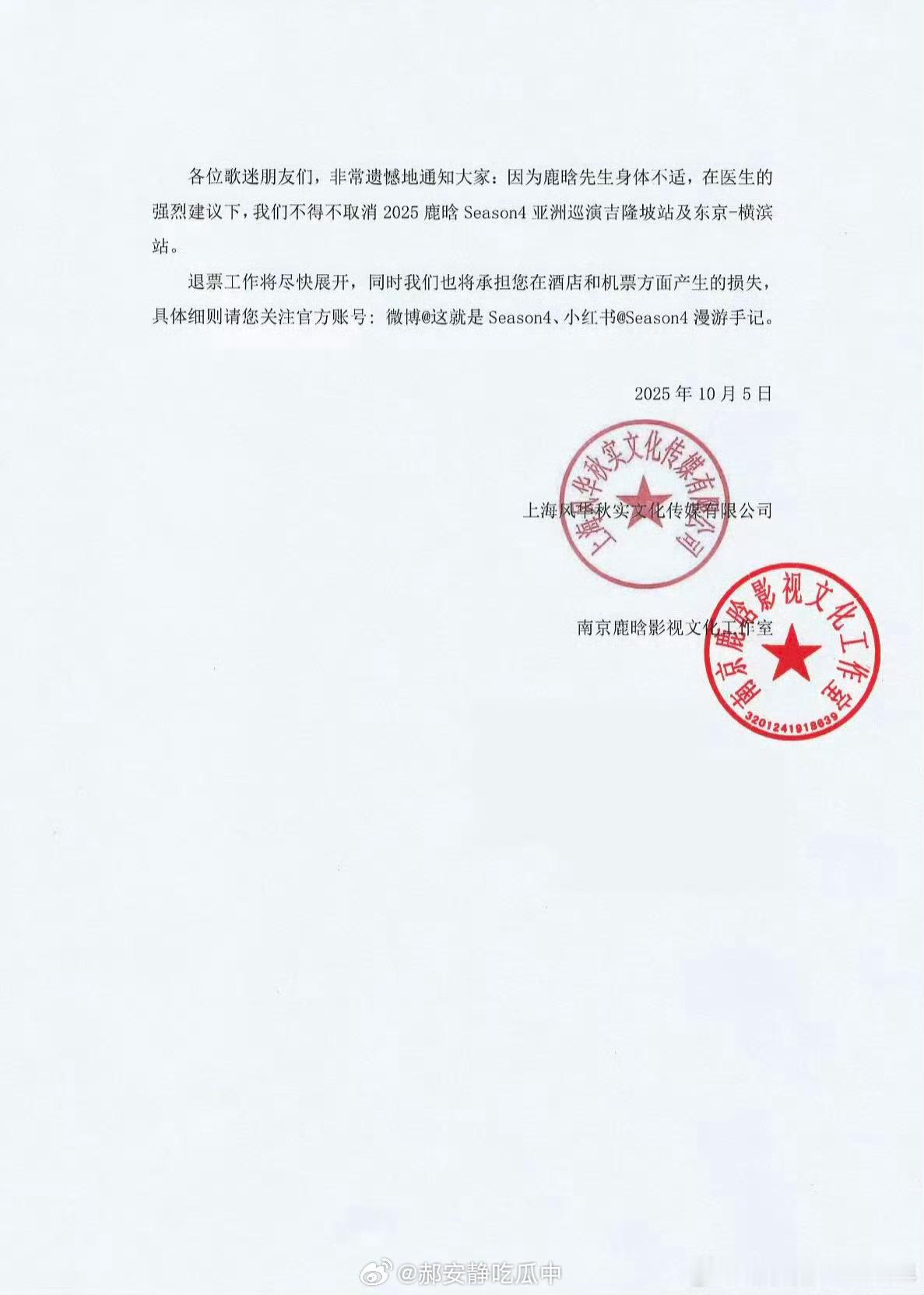 鹿晗因身体不适取消两场演出,好好休养[好事甜圆]
