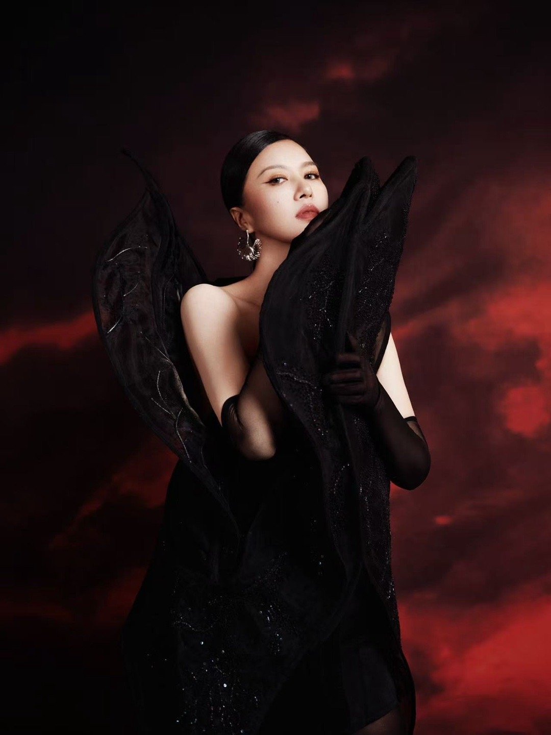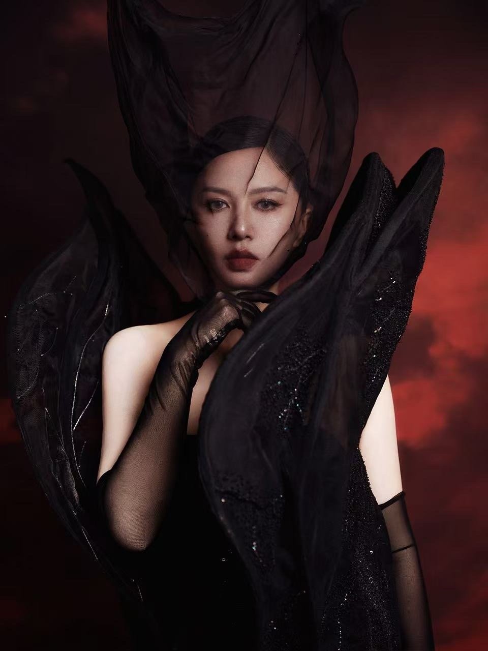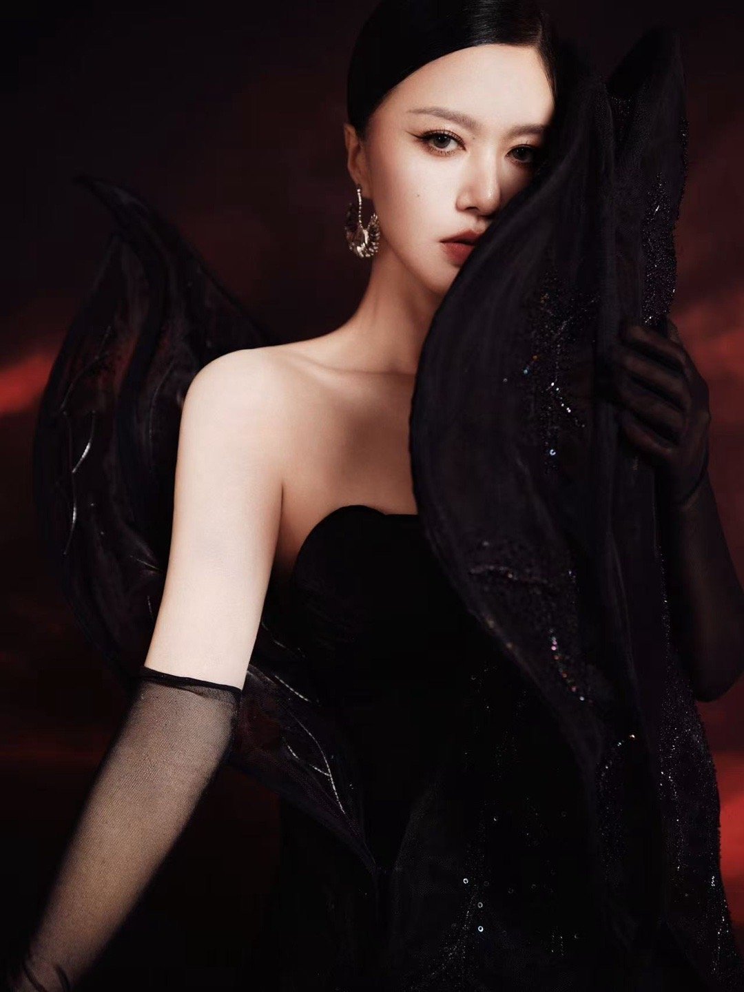 这居然是谭维维谭维维音乐会造型太惊艳了!狭长眼线搭配轻纱遮面,黑色立体珠花短裙