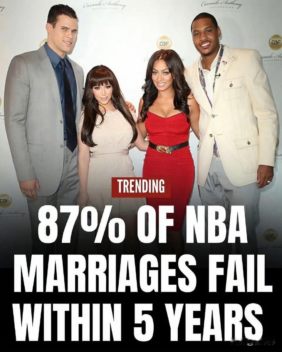 离婚率真的高!据统计,NBA球员中,有87%的人,婚姻都撑不过5年时间! 这也是非常正常,毕竟NBA球员收入高,诱惑大,很难始终保持专一! 所以说,詹姆斯和库里是多么难得,确实是绝对的好男人,没有任何绯闻! 要不就像杜兰特一样,不结婚,那肯定就不会离婚了,果然还是小帅潇洒! 否则离婚的话,要是没有婚前财产公证,那离婚得被分走一半的财产! 最夸张就是卡戴珊家族,为了热度,都会找NBA球员制造话题,然后再甩掉! 奥多姆就是最大的受害者,被卡戴珊甩了之后,一度自暴自弃,差点挂了! NBA球员作为超高收入的人群,但是,不仅容易破产,也容易离婚,这是事实!