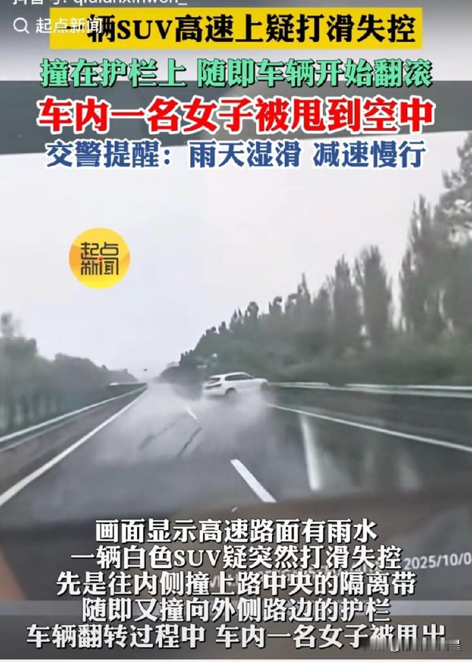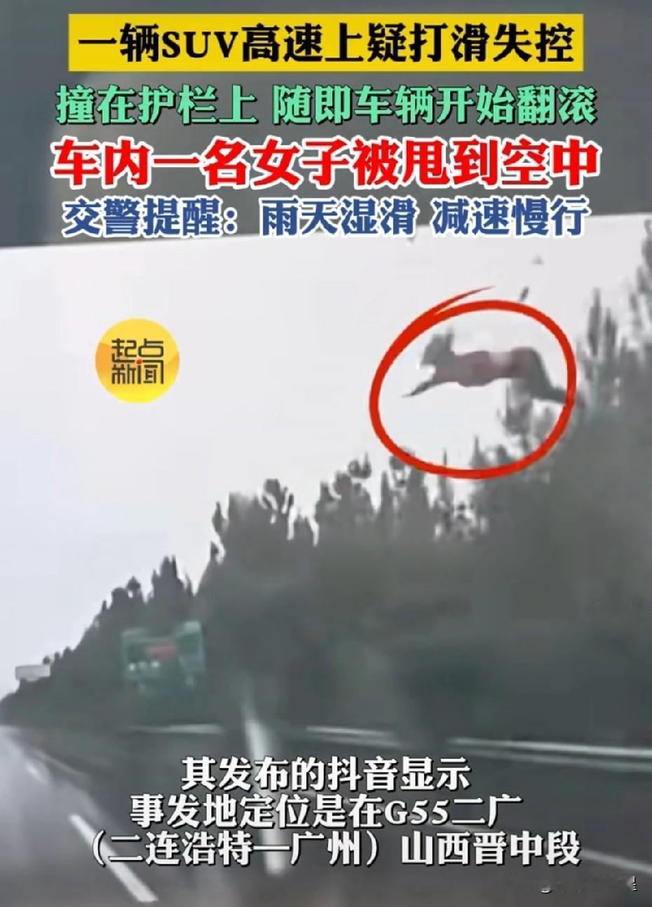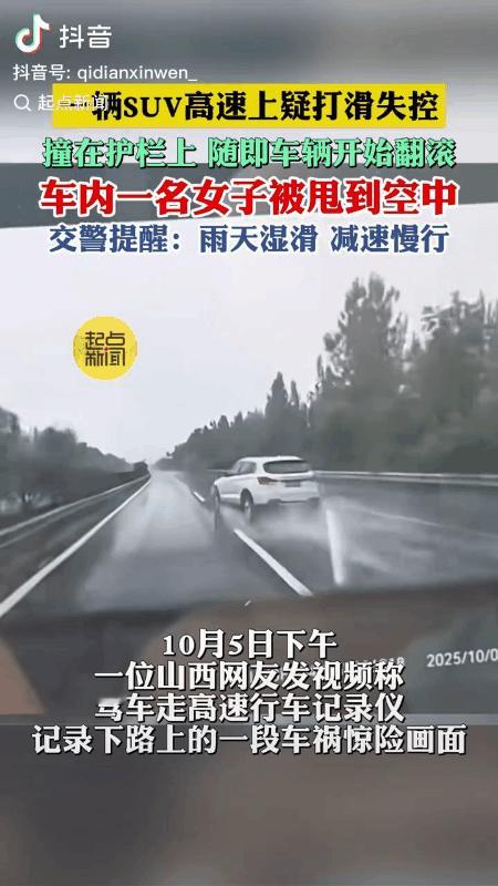 好惊悚!这是赶着回家过年吗? 近日,一位山西网友发布视频称,自己驾车行驶在G55二广高速(二连浩特至广州)山西晋中段时,行车记录仪记录下一段惊险的事故画面。 画面中,高速路面有积水,一辆白色SUV轿车疑似因打滑突然失控,先是撞上左侧护栏,接着又撞上右侧护栏。车辆翻转过程中,车内一名女子被甩到空中。 记者联系了山西晋中段高速交警,交警表示,由于发布视频的并非事故当事人,所以不便透露事故原因。 不过,从视频画面能够看出,事故车辆车速极快。车辆撞上护栏翻转时,一名女子被甩到空中,随后车辆翻出护栏外。尽管行车记录仪未记录后续情况,但女子被甩得那么高,大概率会受伤,轿车司机恐怕也难以幸免。 所以,驾车出行一定要留意交通安全。特别是近期持续降雨,路况不佳,国庆假期出门旅游或准备返程的朋友,务必谨慎驾驶,慢一点,再慢一点。高速惊魂瞬间 高速路车祸
