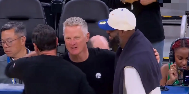 全场比赛结束时,只见勇士主教练科尔径直走向了詹姆斯,第一个与詹姆斯拥抱,并且还有说有笑的,然后才同走过来的雷迪克简单拥抱致意。