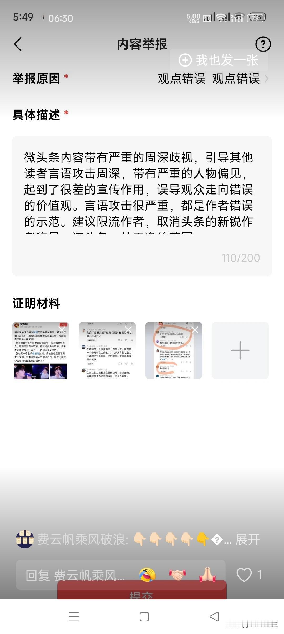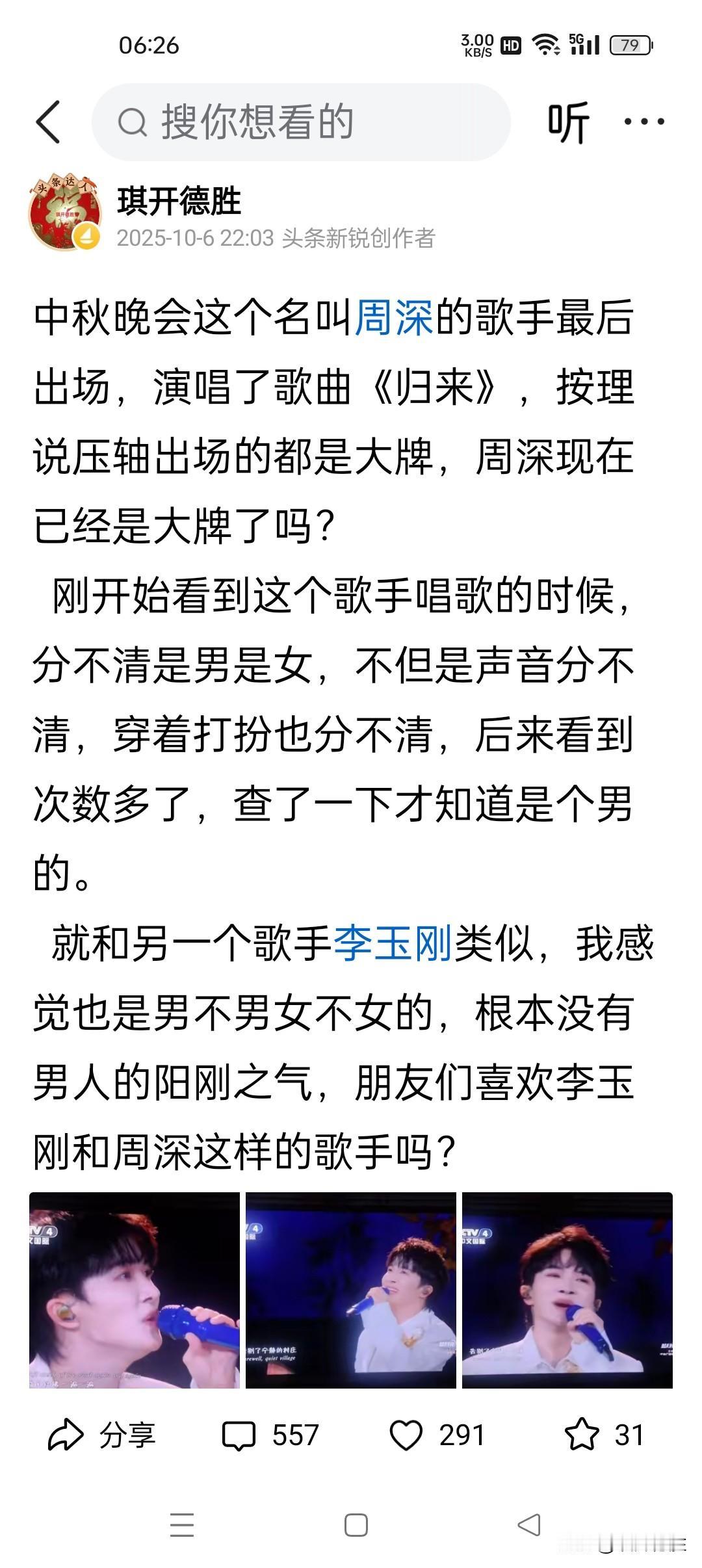 看完中秋晚会,在头条上发了个看中秋晚会对周深唱歌的感受,没想到早晨醒来,这个微头条竟成了爆款,评论500多条,12人转发! 有意思的是大概是周深的粉丝吧,北京的一个叫“费云帆乘风破浪”的还把我给投诉举报了,说让我这个嘴嗨之人付出应有的代价,还建议取消我的头条新锐创作者称号。 我想问一下这位周深的粉丝,你看到评论区里大家对周深的评价吗?大多数人是不喜欢周深这种男不男女不女的唱法和打扮的,你喜欢就喜欢呗,我的看法也是大多数观众的感受:男人就要有男人的阳刚之气! 昨晚的中秋晚会色调有些阴暗,没有明快喜庆的氛围,真不明白为什么导演会这样安排。