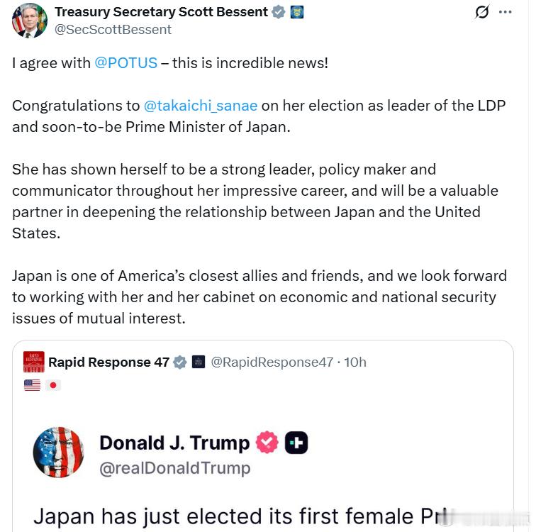财长贝森特:我同意总统的看法——这是令人振奋的消息!祝贺高苗当选自民党党首,并即将成为日本首相。