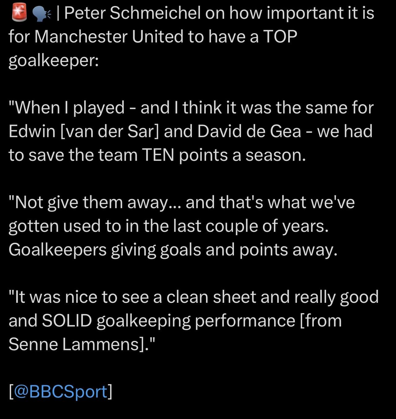 合格的门将,一年可以为球队多拿10个联赛积分! BBC对舒梅切尔的采访如下: 🔴拥有一名顶级门将对曼联来说有多重要: 🔴“当我上场时——我想埃德温(范德萨)和大卫德赫亚也一样——我们必须每个赛季为球队多守出10 分。 🔴“守门失误丢球……过去几年我们已经习惯了。守门员丢掉进球和分数太多了。” 🔴“很高兴看到塞内·拉门斯的守门表现非常出色、扎实,并且零封对手。” 🔴“我认为他的信心在(首秀期间)增强了,你可以从第一次传中就看出来,马泰斯·德里赫特的反应非常棒,防守队员在受到压力时希望通过他的反应来减轻一些压力。 🔴“他还年轻,几乎没有踢过任何正式比赛。不幸的是,这些年来我们看到,很多伟大的球员来到曼联,压力无情地逼近——他们根本无法应对。像我这样的人再给他施加压力,那就太愚蠢了。” 🔴“他表现不错,现在他有国际比赛假期,下一场比赛他也要保持同样的状态。然后我们看看他如何进步,所有门将都会犯错,到那时我们才能发现一个人有多优秀。”
