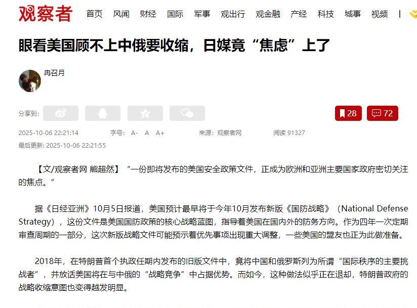 美国都忙着收缩防务、顾不上盯中俄了,日本媒体倒先急得坐不住了!明明是美国自己要把重心拽回本土,跟日本八竿子打不着的战略调整,日媒却接二连三发文焦虑,一会儿怕美国砍亚洲军援,一会儿愁“亚洲防线”落了自己,那股子慌劲儿把美国收缩的影响衬得明明白白。这焦虑的根子,其实就是日本把安全全绑在美国身上的依赖病,而美国接下来的动作,更让这份焦虑没处藏。 咱先说说中国的态度,特别实在:咱就走和平发展的路,国防政策也是防守型的,从来不搞军事扩张,也不惦记抢别人的地盘。 早几年美国拿《国防战略》炒“中国威胁”,咱国防部当时就清清楚楚反驳了,说那就是“你输我赢”的老一套冷战想法,跟现在和平的大方向根本不搭。 不管美国的战略怎么变来变去,咱想维护世界和平、安安稳稳搞发展的心思,从来没动过。 再看美国这边,现在是真没精力管海外的事儿了。新搞的《国防战略》里写得明明白白,要先保自己本土和西半球的安全,不再像以前那样盯着中俄瞎折腾。 之前还拉着盟友喊“要跟中俄竞争”,现在说收缩就收缩,欧洲那边,像波罗的海那三个国家,之前靠美国给的军事经费搞训练、修装备,现在美国说2026年起要砍这笔钱,这三国立马就没了底气。 亚洲这边更敷衍,也就帮菲律宾升级个小基地、整个无人机维修点,看着挺热闹,其实没投啥真东西。 就连美国自己吹的“复制者”无人机计划,搞了两年软件还没整明白,根本没法用,自己都顾不过来,哪还有心思管盟友? 美国一收缩,最慌的就是日本。这些年日本把安全全绑在美国身上,现在美国要撤,它自己的防务根本接不上趟。 今年日本的防卫预算都涨到8.7万亿日元了,又是买F-35战机,又是搞高超音速导弹,还弄了个太空作战的队伍,看着忙得不行,其实就是怕美国撒手不管。 它更怕的是美国划“亚洲防线”的时候,把韩国、台湾地区踢出去,就剩它自己,到时候驻日美军基地孤零零的,根本形成不了防线。所以《日经亚洲》天天写文章焦虑,就怕美国把它扔了不管。 说实在的,美国先保自己本土没啥毛病,哪个国家不该先顾着自己?但问题是,它之前拉着盟友喊“咱一起扛”,现在说撤就撤,把盟友当用过的抹布随手扔,这哪像个当“大哥”的样儿? 日本的焦虑也怪不了别人,谁让它把自己的安全全靠在美国身上?依赖惯了,一旦靠山要走,自然就慌了手脚。 那些总想着靠美国撑场面的国家,真得醒醒了:安全这事儿,不是说你跟对人就行,得自己有本事,还得跟旁边的国家好好相处,别总想着拉外人来挑事。 中国一直走和平发展的路,不跟人对着干,也不欺负人,这才是长久安全的正道,现在的世界,比的不是谁盟友多,而是谁能安安稳稳搞发展,谁能跟大家一起赚钱、一起好。 说到底,靠别人不如靠自己,好好合作比对着干靠谱,这才是最实在的道理。