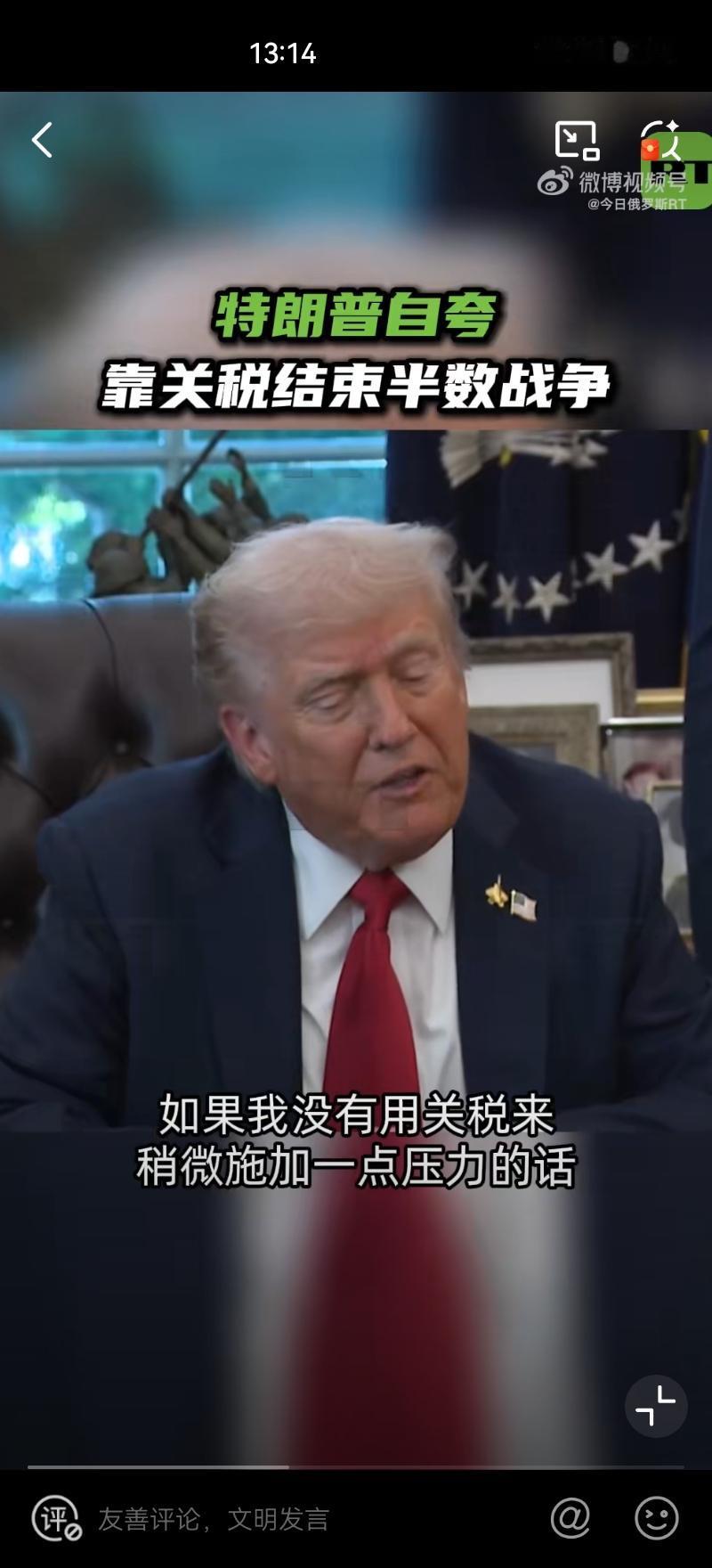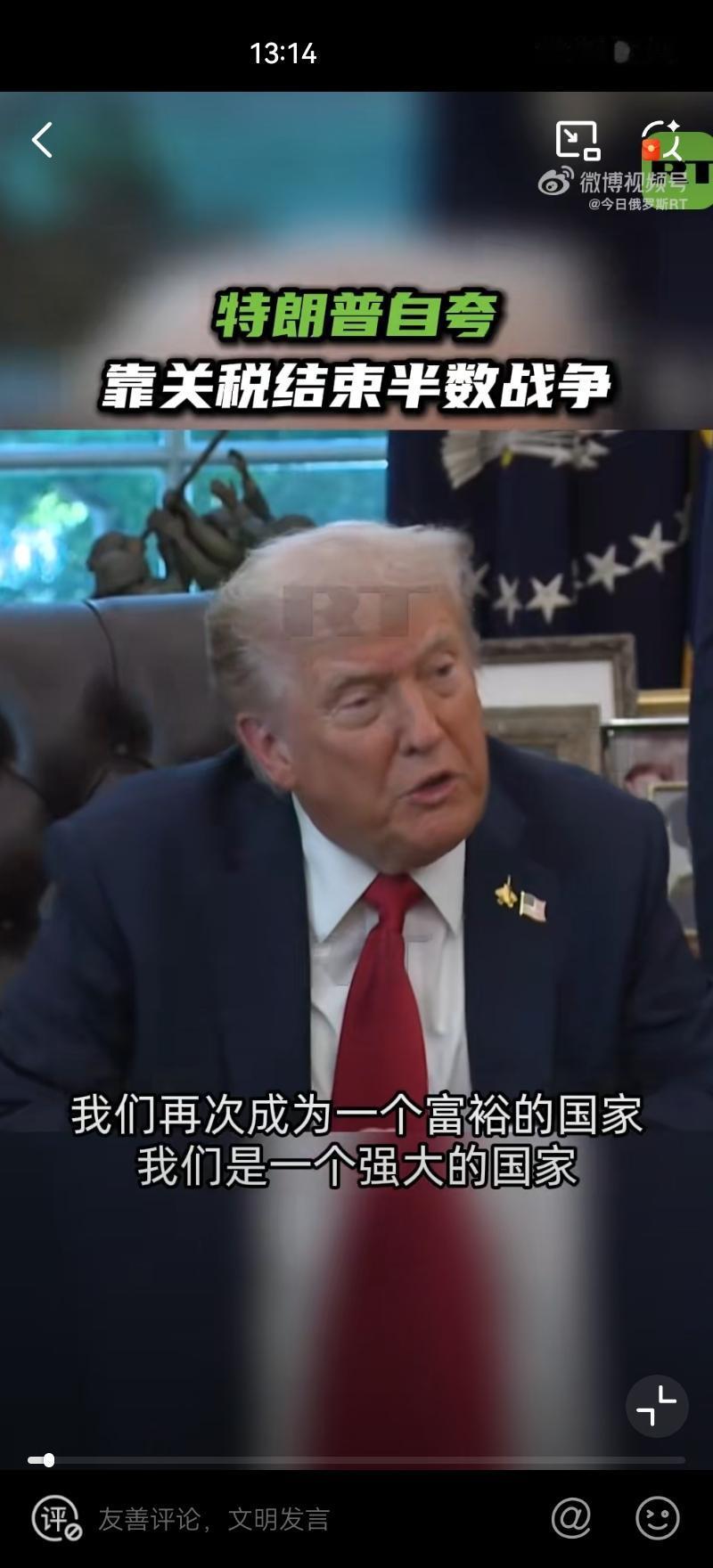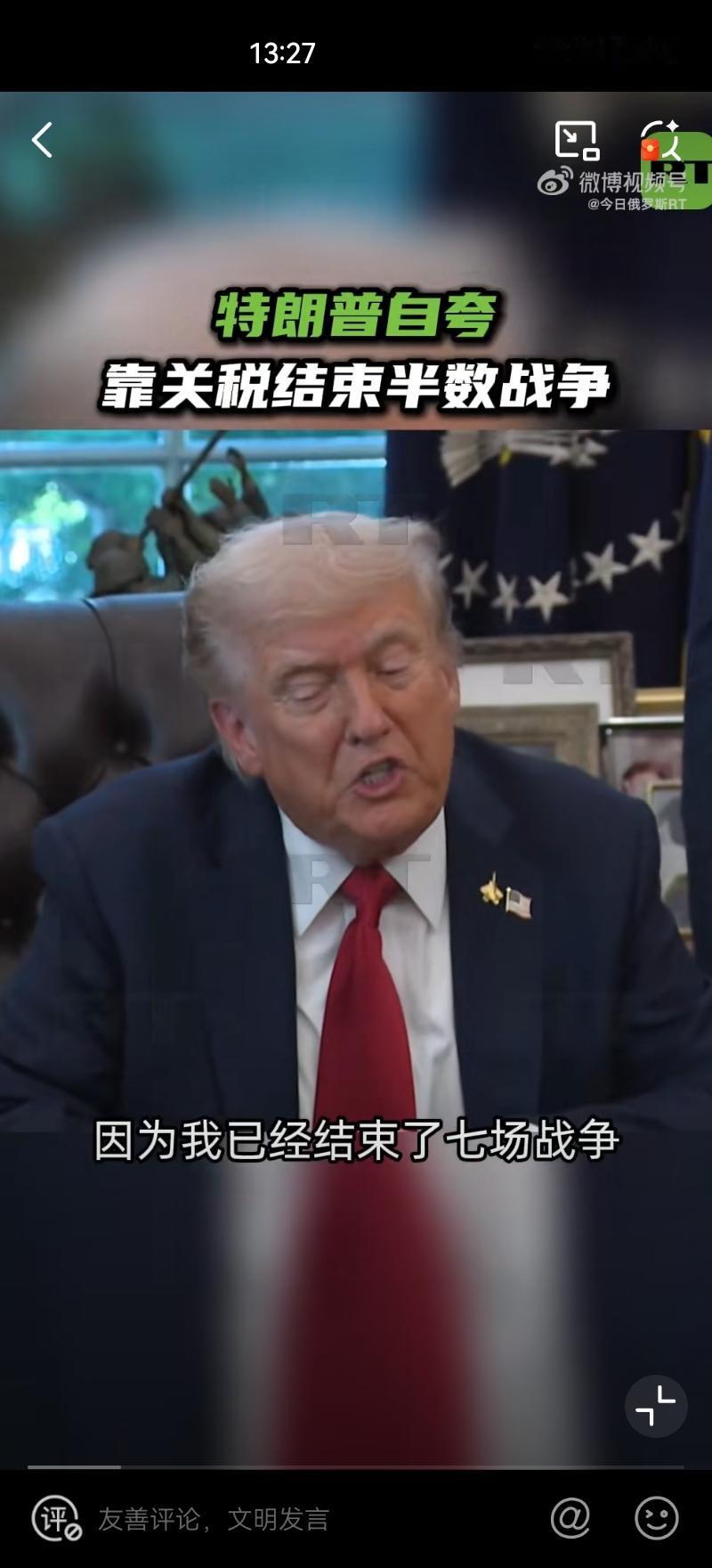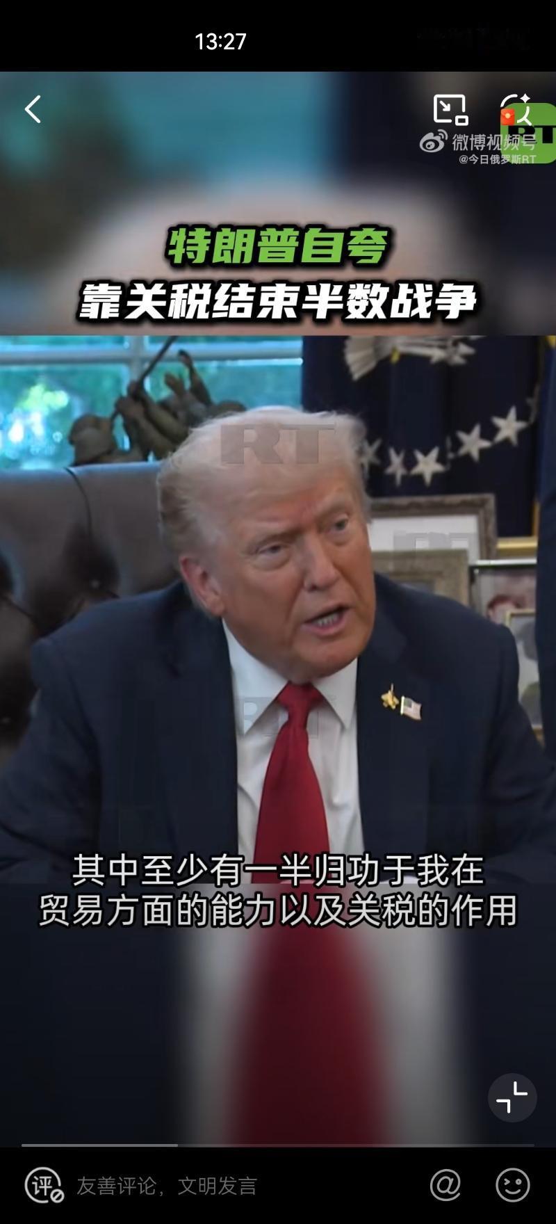 10月6日,美国总统特朗普重申自己借助关税解决了7场冲突,特朗普还强调,他可能很快就会解决第八场冲突,并暗示这场冲突是俄乌冲突 这次言论我愿称为:特朗普式修辞! “关税战神”特朗普吹嘘用关税“结束七场战争”! 实际上全是大话,他列不出具体的国际战事,停战也不是因为关税。这些只是为了塑造他自己“能力强大”的形象,为有争议的关税政策贴金,顺便攻击对手。 实属政治包装,经不起一点推敲,这套说辞,与其说是外交成果,不如说是专供国内支持者消费的“政治爽文”, (图片来源:今日俄罗斯微博视频截图)