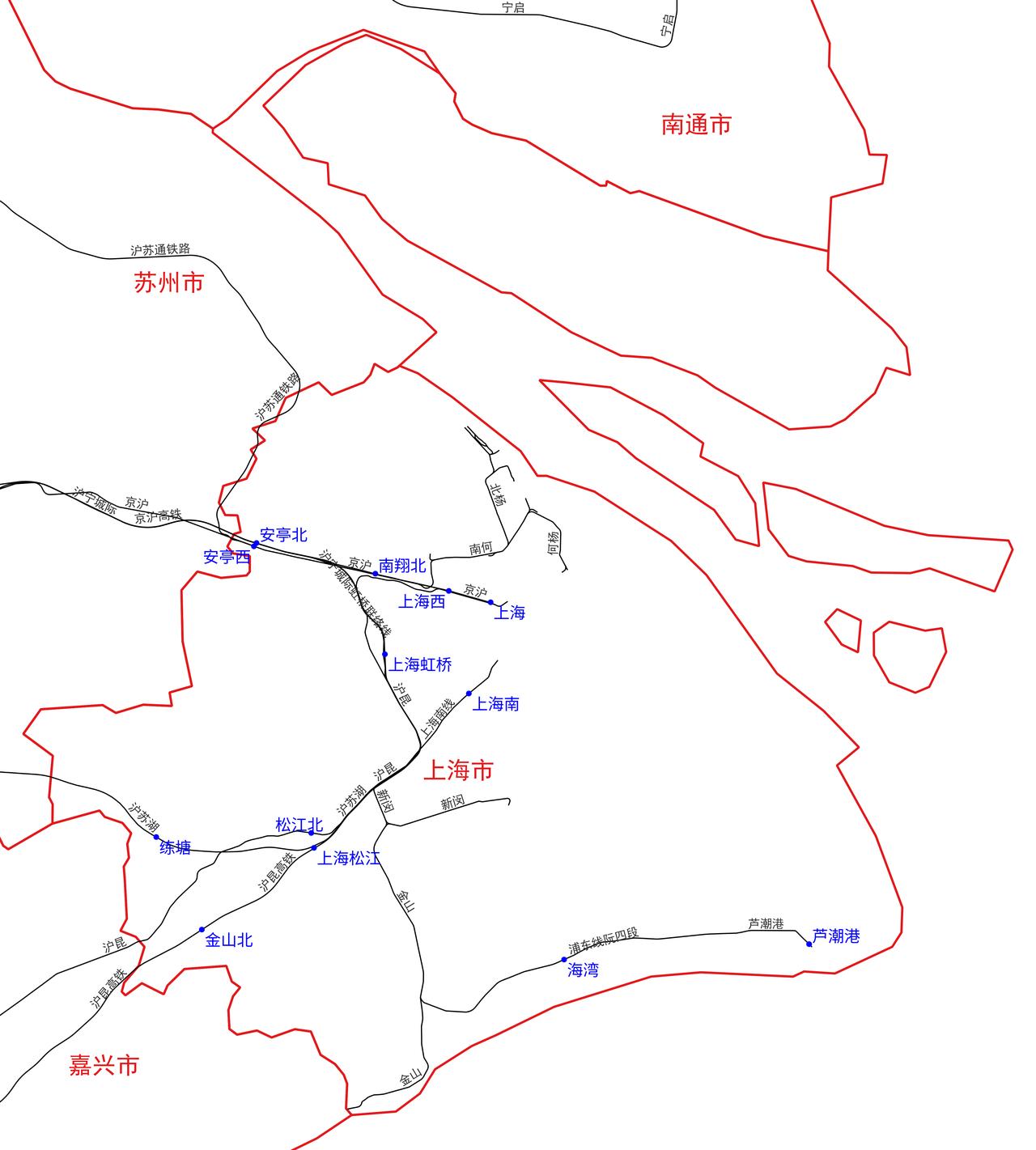 上海市铁路及客运站分布图 根据铁路12360数据,上海市目前有以下13个铁路客运站: 上海站 上海虹桥站 上海南站 上海松江站 上海西站 安亭北站 安亭西站 海湾站 金山北站 练塘站 芦潮港站 南翔北站 松江北站