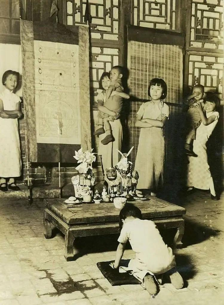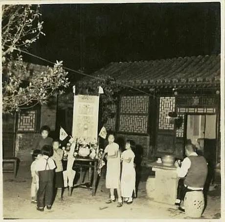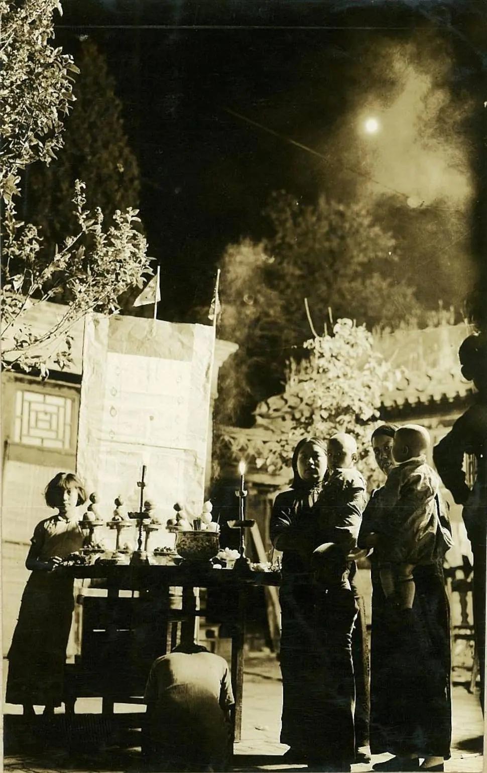 1939年中秋节,北京一个家庭的祭月仪式。通过供奉兔儿爷、摆放供品等仪式,表达对月亮的崇拜和对生活的美好祈愿。 桌上摆放着兔儿爷是老北京中秋祭月的传统民俗玩具,有辟邪、祈福的含义。