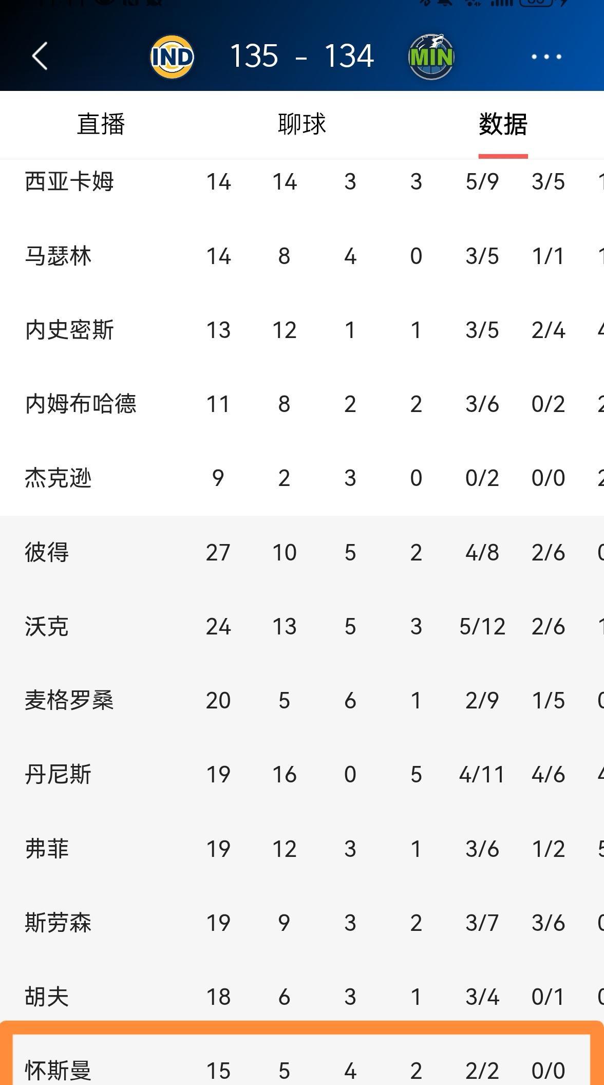 步行者大将怀斯曼真是太让人喜出望外了!在今天步行者以135:134险胜森林狼的季
