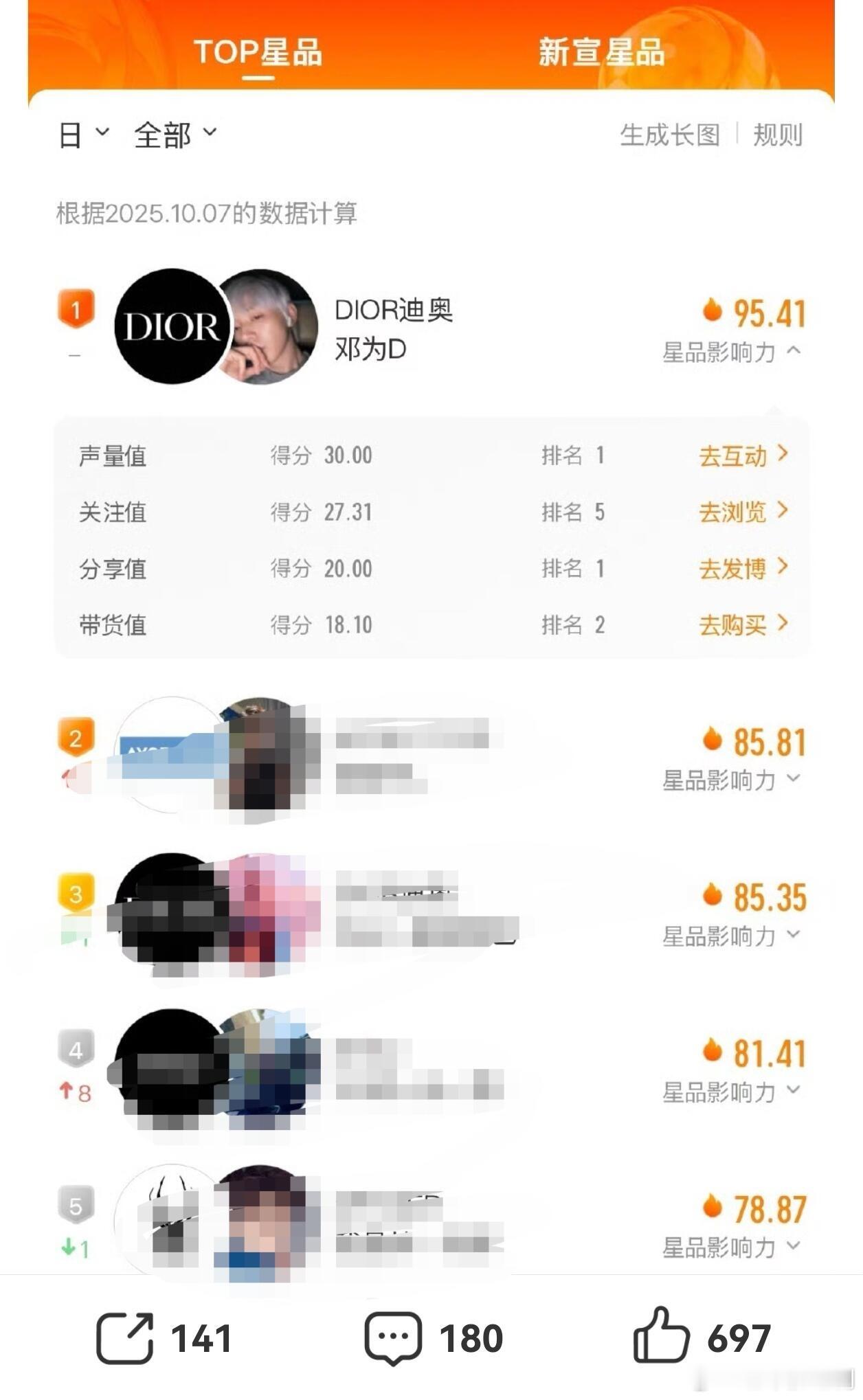 邓为巴黎时装周累积接受近40家国外权威媒体收录和报道后,再度拿下星品影响力第一,名副其实闪耀巴黎