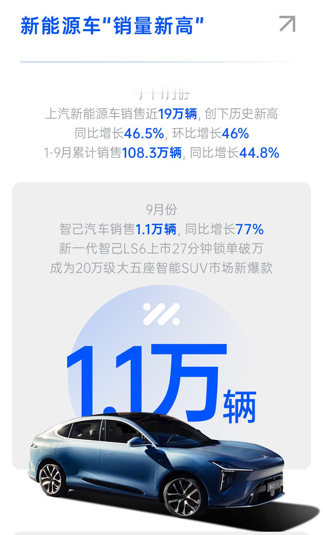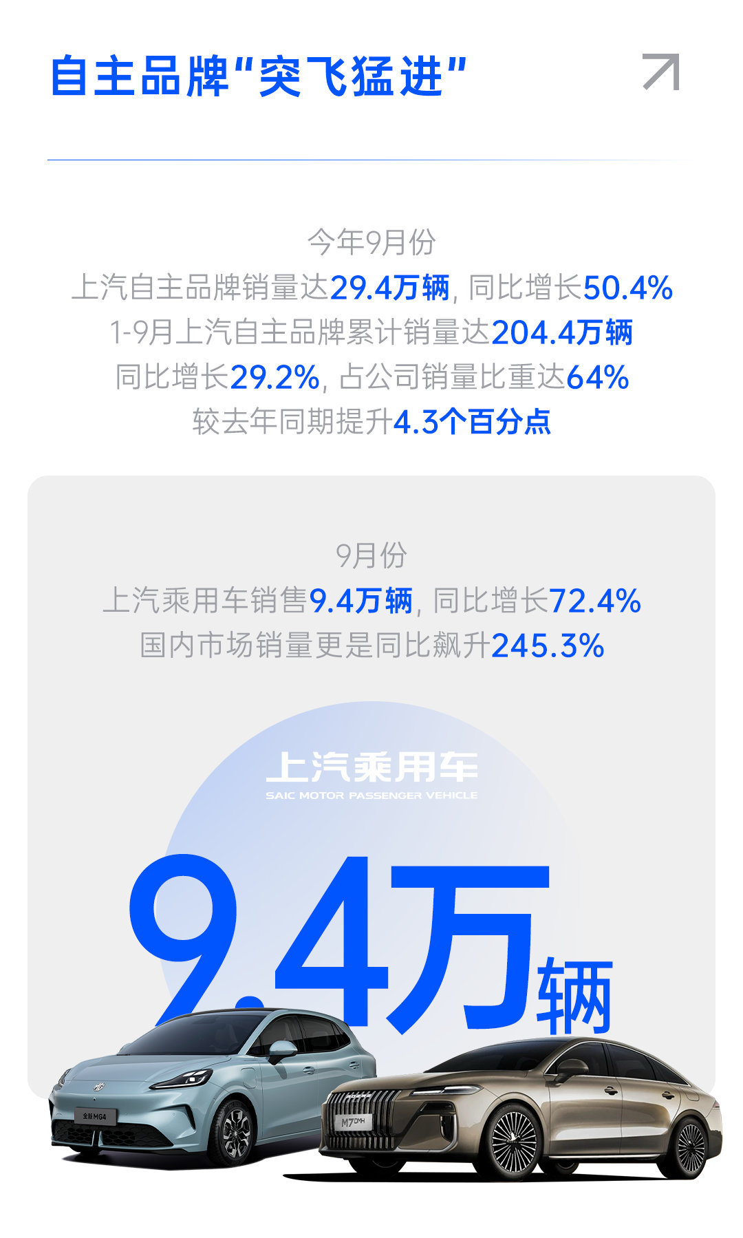 今年 9 月份,上汽自主品牌销售 29.4 万辆,同比增长 50.4%。从官方获悉,其中新能源车销售近 19 万辆,同比增长 46.5%。