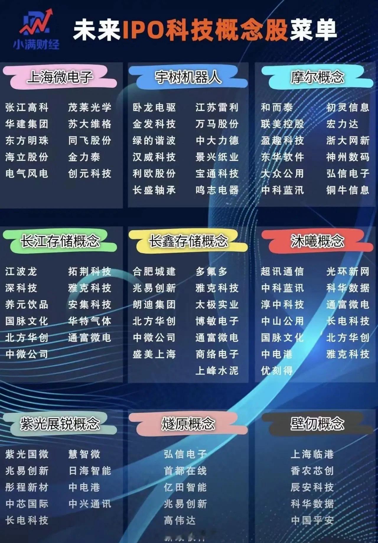 🔍 特点:信息图以科技感视觉设计呈现,将热门科技IPO概念进行分类,每类下给出关联A股上市公司,便于投资者追踪产业链布局。
