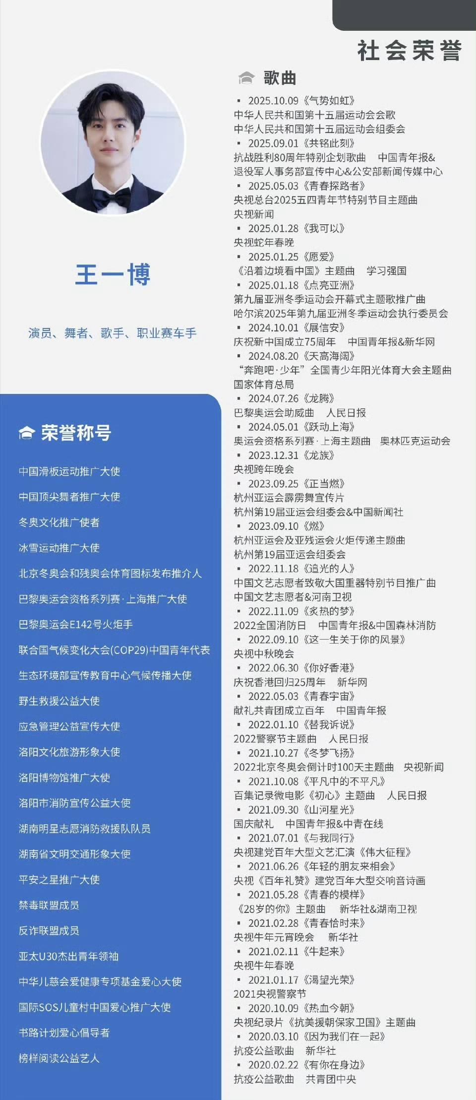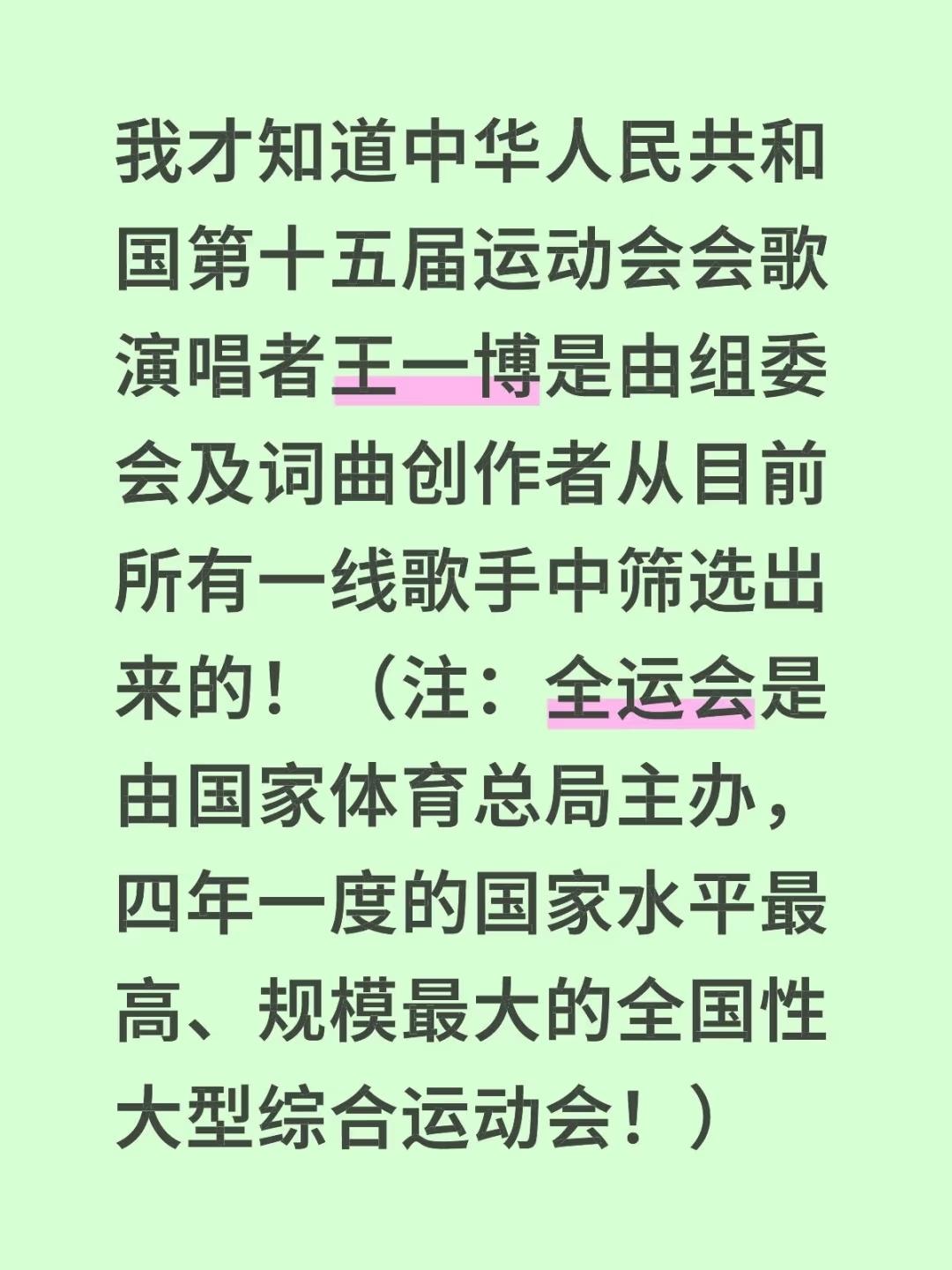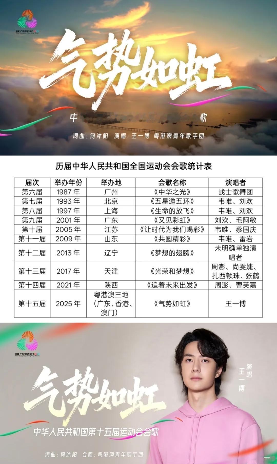 国内最高水平、最大规模的综合性运动会,第十五届全运会会歌《气势如虹》为什么演唱者定为王一博? 原来是十五运会组委会和词组创作从目前所有的一线歌手中筛选出来的!!!是所有的一线歌手中! 不仅仅是因为王一博顶级的流量和影响力号召力,更因为王一博身上“有一种力量和一种倔强,和歌曲相符”。 而在看到网友统计的历届全运会会歌演唱者后,只想说王一博真的特别特别厉害!真的特别特别正能量,主流官方活动宣传门面担当当之无愧[赞]。 王一博