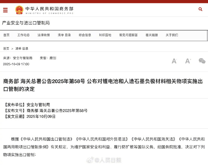 #锂电池出口管制##人造石墨负极材料出口管制#【商务部、海关总署:对锂电池和人造石墨负极材料相关物项实施出口管制】今天,商务部、海关总署发布公告,公布对锂电池和人造石墨负极材料相关物项实施出口管制的决定。内容如下: