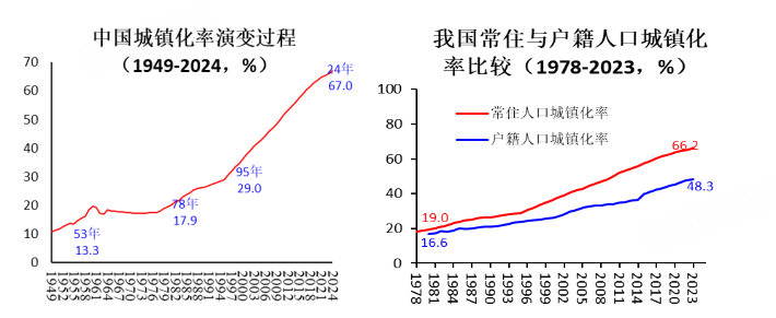 下面左图数据显示用城镇常住人口占总人口比例衡量的我国城市化进程,显示改革开放时期特别是上世纪90年代下半期以后城市化加速推进,2024年城市化率已经攀升到67%从一个角度体现我国经济长期发展与现代化转型取得历史性成就。然而户口制度难以退出伴随常住人口与户籍人口城市化指标差异长期存在。下面右图显示,改革初期人口流动受较多限制,两个城市化指标差别较小:如1978年常住与户籍人口城镇化率分别为19%和16.6%,差值只有2.4个百分点;此后两个城市化率指标差值呈现扩大趋势,2023年常住与户籍人口城镇化率分别为66.2%和48.3%,二者仍相差17.9个百分点;同年我国总人口14.0967亿人,推测有2.5233亿城镇常住人口尚未获得城镇户籍。另外还要考虑城镇户籍人口异地居住情况:根据人口“七普”数据,2020年全国人户分离人口为4.9276亿人,除去市辖区内人户分离人口1.1695亿人,流动人口总数有为3.7582亿人[15],减去2.523亿农村户籍城镇常住人口,估计城镇户籍异地居住人口约为1.235亿。