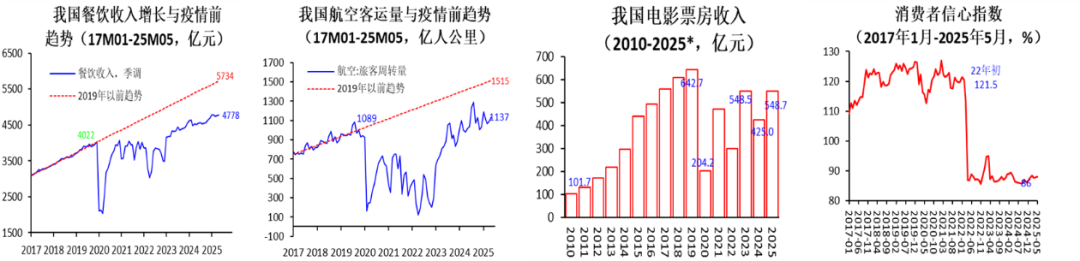 首先是疫情大流行冲击仍存在遗滞影响。走出疫情近三年来,我国经济持续复苏增长在诸多领域取得显著成就,然而充分修复疫情冲击负面影响仍有待时日。观察有关数据,一些重要民生消费指标如餐饮收入、航空客运、电影票房,目前仍尚未达到疫情前趋势延伸水平。例如电影票房2024年达到425亿元,显著超过疫情三年平均325亿元,但是与2023年复苏初年548.5亿元比较明显回落,更是不及2919年的624.7亿元峰值;由于《哪吒II》现象级影片热销推高今年上半年电影票房,用上半年数据预估的全年票房将上升达547亿元,不过仍低于疫情前两年水平。另外像餐饮收入与航空客运量等重要消费指标,走出疫情后出现较大幅度恢复性增长,然而仍然没有达到疫情前趋势延伸水平。从消费者信心指数看,该指标在2022年抗疫最艰难阶段断崖式下跌后2023年初显著反弹,但是随着经济复苏内生动能不足问题浮现,再次回落并在低位徘徊至今。