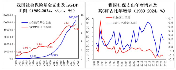 2019年以后我国社保支出占GDP比例增速有所回落,受2021-2022年疫情冲击影响该指标出现两年负值,走出疫情后2023-2024年增量均值回升到0.26个百分点的较高水平,不过2019-2024六年整体增量均值为0.10个百分点,仍低于金融危机前20年的0.12个百分点平均水平。总之,经过几十年发展,我国已建成世界上规模最大的社会保障体系,2024年我国社保支出10.7万亿元,占GDP比例7.86%,代表我国社会保障事业取得历史性进展。