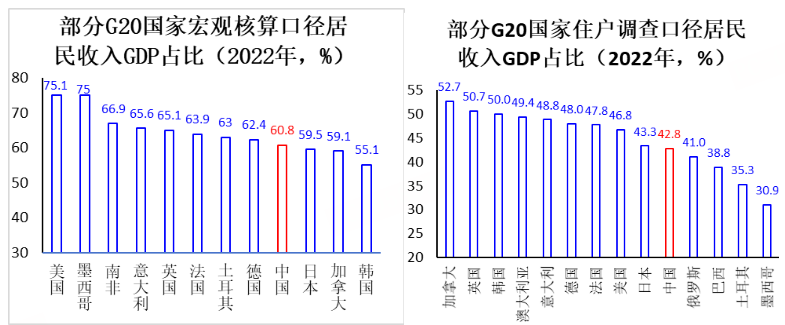 对抽样调查居民收入进行国际比较面临更多数据问题:除未能找到阿根廷、印度、印尼、南非、沙特阿拉伯等G20新兴经济体相关数据外,G20发达经济体微观调查的居民人均收入有的采用“等值化收入(equivalisedincome)”口径统计,把家庭可支配收入按“等值人口”分摊到个体,以控制不同家庭规模或结构因素的影响,因而无法直接与我国相关指标比较。要得到与我国可比的人均可支配收入,对基于“等值成人”方法统计数据需采用“等值成人收入×等值成人数÷家庭人口数”方法调整。目前没找到正式发表的有关研究文献,但是网络发布的署名李晦阑的题为“中国离发达国家还有多远——基于可支配收入的对比分析”文章对此做了初步数据整理,该文报告了几十个国家抽样调查居民收入GDP占比数据[5]。上右图报告十多个G20国家住户调查居民收入占GDP比例数据显示,我国该指标与发达国家比较显著较低,然而不同程度高于几个G20新兴经济体。
