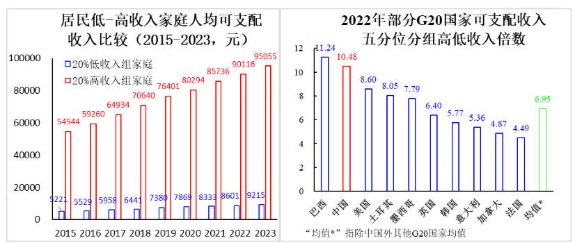 一是从居民五等份收入分组(Equaldivisionmethod)统计数据观察,下面左图显示2015-2023年我国居民五等份人均可支配收入分组中的20%高收入组相对20%低收入组的倍数,数据显示该指标最高值为2018年的10.97,最低是2020年的10.20,2023年为10.32,均值为10.52%,可见居民五等份收入分组高低收入组人均收入差距为十倍有余。2015年OECD发布《《同心协力:为何减少不平等有益于所有人[6]》英文报告,其中第56页表格数据显示,2013年OECD国家最高20%收入人群收入占比为39.4%,最低20%人群输入占比为7.7%,二者倍数为5.12,我国2015年该指标显示的收入差距倍数(10.45)是2013年OECD该指标平均值5.12的2.04倍。从下面右图显示的部分G20成员国居民收入五分位分组高低收入倍数看,中国为10.48,仅次于巴西的11.24,比不包含我国的样本国均值6.95高出50.8%。这个指标显示在国际比较意义上我国居民收入差距较大。