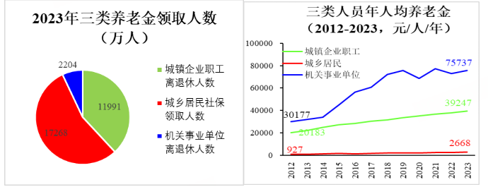 我国社保资源分配的结构性差异,对居民消费增长带来更需关注的制约影响。社保涵盖养老、医疗、失业、工伤与生育保险中养老金规模最大,我国基本养老保险对象人群看可分为两类三部分:第一类是职工基本养老保险,参保对象包括城镇就业的两部分对象,一部分是机关事业单位工作人员,另一部分是城镇企业职工;第二类是无固定雇主或未参加职工养老保险的城乡居民。下面左图显示,近年我国领取养老金人员总数为3.146亿人,其中机关事业单位离退休人员、城镇企业职工离退休人员和城乡居民等三部分养老人群数量,分别为2204.32万人、1.199亿人和1.727亿人,各自占总人数比例分别为7.01%、38.11%和54.88%。
