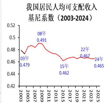 二是我国基尼系数(GiniCoefficient)也持续处于偏高水平。基尼系数是衡量一个国家或地区居民收入分配平等程度,取值范围从0到1表示从完全平等到最不平等,一般认为系数值0-0.2为收入分配高度平等,0.2-0.3相对平等较合理,0.3-0.4基本合理区间,0.4-0.5分配差距较大需较多关注和警惕,0.5以上是差距悬殊的高风险区间。下图报告统计局数据显示,进入新世纪以来,我国基尼系数变化大体呈现三个阶段走势:一是新世纪初年超预期增长阶段,基尼系数从2003年0.479进一步攀升到2008年0.491即接近0.5的高风险区间;二是此后几年基尼系数持续显著下降,到2015年回落到0.462较低水平;三是此后近十年出现温和回升和稳中有降状态,2022年回升到0.467,2024年边际回落到0.465。可见总体而言我国收入分配差距维持偏高水平。此外,基于学界部分有关基尼系数估计结果,我国收入分配差距可能显著高于官方数据。