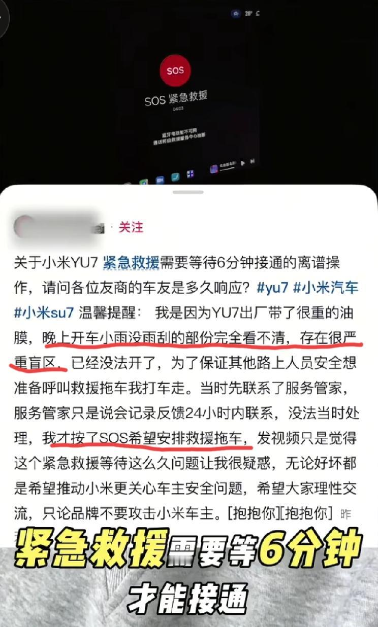 这两天网上疯传的一段视频,大概是这么一个事情经过: 某米车主雨天开车在路上,因为没雨刮的部位完全看不清,存在很严重的盲区,车主不得已按了sos紧急救援,谁知道这个救援电话让车主等待了足足6分钟,其中4分多钟的时候,里面响起“你已进入排队中,请耐心等待”的声音…… 有网友吐槽:这款品牌的汽车就是这样,提车要排队,救援也要排队。谁叫人家车卖的这么好呢,排个队不是很正常吗!