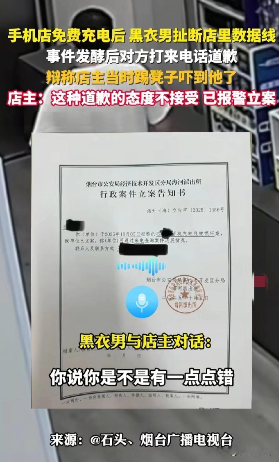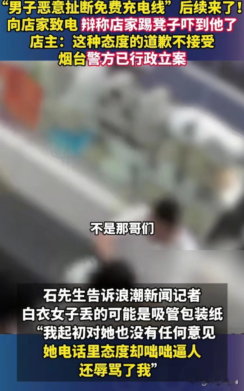 扯断免费充电线后续来了! 男子给店主打电话声称“你踢了一下凳子吓我一跳,你是不有一点点错”,并且给店主道歉,但是电话里的语气给店主的感觉是不诚恳,店主不接受道歉。 同行的白衣女子也是给店主打电话否认自己扔的是泡泡糖,让店主下架视频,还说要请律师! 但其实到现在大家都不知道该女子扔的是什么,泡泡糖是网友们的猜测,店主表示“可能是吸管包装纸”。 但是扔什么是重点吗?垃圾就该扔到垃圾桶里,这一点连小孩子都知道。 目前扯断充电线男子已经被烟台警方行政立案! 有网友表示“不是知道错了,是害怕了”。 也有网友表示“物以类聚,人以群分。” 那对此您怎么看?
