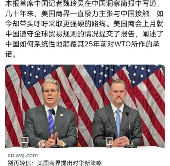 美国商会对我们非常愤怒!美国商会表示,必须对中国来硬的,不能轻信中国了!10月8日,美国华尔街日报刊文表示,美国商会9月间发表报告,阐述了中国如何“系统性地颠覆”其25年前对世界贸易组织(WTO)的承诺。该报告声称,中国将市场改革和减少国家干预的承诺抛在一边,取而代之的是借助激进的产业政策、强制技术转让。 在他们眼里,中国就是言行不一的典型——嘴上天天喊着多边主义,实际却在悄悄打一场经济消耗战。 顺着这个话头,美国商会直接亮明了态度:美国必须对中国采取更加强硬的政策,而且得逼着中国政府取消对美国大豆、玉米这些农产品的报复性关税。 明眼人都能看出来,从这份报告的字里行间能清楚感受到,美国方面现在满肚子火气,所以才一门心思主张要对中国来硬的。 可他们压根没提,中国当初对美国农产品加征关税,根本不是平白无故的举动。 最早是美国单方面先对中国输美农产品加了高关税,中国出于反制才做出回应,这完全是维护自身利益的正当做法。 就拿大豆来说,之前美国大豆基础价本来比巴西还低40美元/吨,折合成人民币差不多280元,可美国自己加了34%的关税后,总成本一下飙到509美元/吨,而巴西大豆到岸价才420美元/吨,算下来美国大豆比南美大豆每吨贵了近千元。 换作任何一个买家,都不会愿意花这种冤枉钱,中国自然也不例外。 更别说中国一直是大豆市场的“头号金主”,2023-2024年还买了2500万吨美国大豆,占美国大豆出口总量的27%,把第二名欧盟远远甩在后面。 要不是关税影响,中国买家也不会用脚投票,从2025年5月起把美国大豆采购量降到零,要知道这可是近30年来头一遭。 美国商会只盯着中国的反制措施喊冤,却对自己这边关税政策造成的后果绝口不提,这种选择性失明的做法实在站不住脚。 再说说他们指责的“产业政策”,中国推进产业升级、发展高端制造,本来就是顺应经济发展规律的正常操作,目的是提升自身产业竞争力,让经济结构更合理,这在全球范围内都是再普遍不过的事。 美国自己也有各种产业扶持政策,之前推出的《芯片与科学法案》《通胀削减法案》,本质上都是在通过政府引导来支持特定产业发展,现在却反过来指责中国的产业政策,这明显是双重标准。 至于“强制技术转让”,中国早就通过立法明确禁止了这种行为,这些年一直严格保护知识产权,不断优化营商环境。 很多在华外资企业都能感受到,中国市场的开放程度一直在提升,所谓“强制技术转让”不过是美国某些势力编造出来的借口,根本没有事实依据。 还有他们说的“不透明”国家安全法,任何国家制定国家安全相关法律,都是为了维护本国主权、安全和发展利益,中国的国家安全法内容公开透明,立法程序也完全符合法治原则,所谓“不透明”不过是美国为了抹黑中国找的理由。 美国商会现在跳出来喊着要对中国来硬的,背后其实藏着自己的小算盘。 美国农业界因为农产品出口受阻早就怨声载道,2025年前七个月美国对华农产品出口总额同比下降53%,玉米、小麦、猪肉这些之前能卖上价的品类,因为加征15%的关税,在中国市场彻底没了竞争力。 美国商会作为代表美国企业利益的组织,自然要为这些企业发声,可他们没想着从自身政策找问题,反而把责任全推到中国身上,这种做法根本解决不了问题。 他们还忘了,中国早就启动了供应商多元化战略,在农产品采购上不再依赖单一国家。 就像巴西,这些年大豆出口占中国市场的份额从2018年的25%猛增到71.1%,2025年出口更是达到1.06亿吨,完全能满足中国需求。 中国还在巴西布局了农业运输项目,港口、铁路都修得顺顺当当,供货稳定,质量也不比美国大豆差。 阿根廷也抓住机会,宣布大豆出口税归零后,短短两天就拿下70亿美元销售额,其中大半都是中国订单。 就算美国真的对中国来硬的,也改变不了中国已经建立起多元供应链的事实,反而可能让美国企业失去更多中国市场的机会。 中国一直坚持多边主义,积极参与全球贸易体系,这些年为世界经济增长做出了巨大贡献。 美国商会所谓的“经济消耗战”,不过是他们对中国正常发展的歪曲解读。 中国始终愿意在平等互利的基础上和各国开展经贸合作,但前提是对方得尊重中国的核心利益,摒弃双重标准,而不是像现在这样,一边指责中国,一边想着用强硬手段逼迫中国让步。 要是美国商会真的想解决问题,就该劝美国政府先反思自己的关税政策,拿出诚意来和中国对话协商,而不是一味地喊着“来硬的”。 毕竟现在的全球经济早已你中有我、我中有你,对抗和施压解决不了任何问题,只有合作共赢才是唯一正确的选择。 美国商会要是连这点都想不明白,继续抱着对抗的思维不放,最后受损的只会是美国自己的企业和民众。