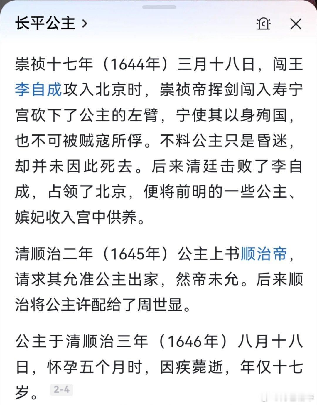 有句讲句,清朝对明朝公主待遇还算可以,比宋朝公主强多了,长平本来她爸给她定的婚就是周世显,后来战乱没结成婚,后面顺治让她嫁的还是这个人,没有随便给她塞个蒙满贵族,婚后没过几天好日子怀孕的时候得病死了,后面的文艺作品里不断给她加反清的形象,更惨的是她妹妹昭仁公主,港剧里面瞎编乱造把昭仁公主搞成个大恶人,其实人家就一个小姑娘,还被她爸杀掉了,悲催的一生还要被后人玷污。