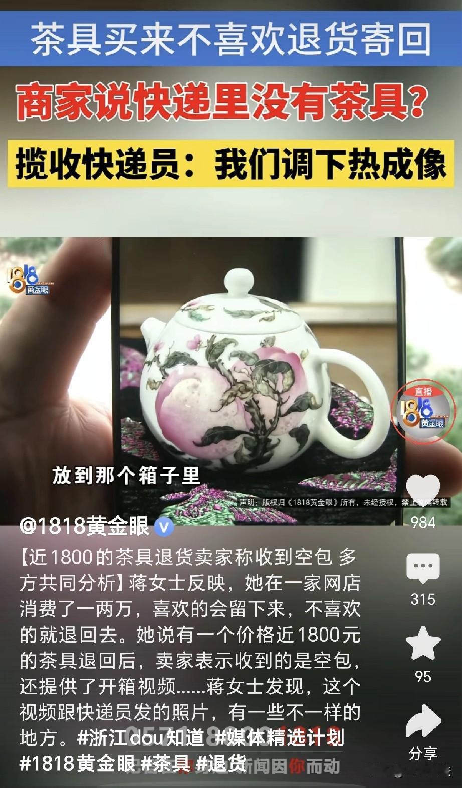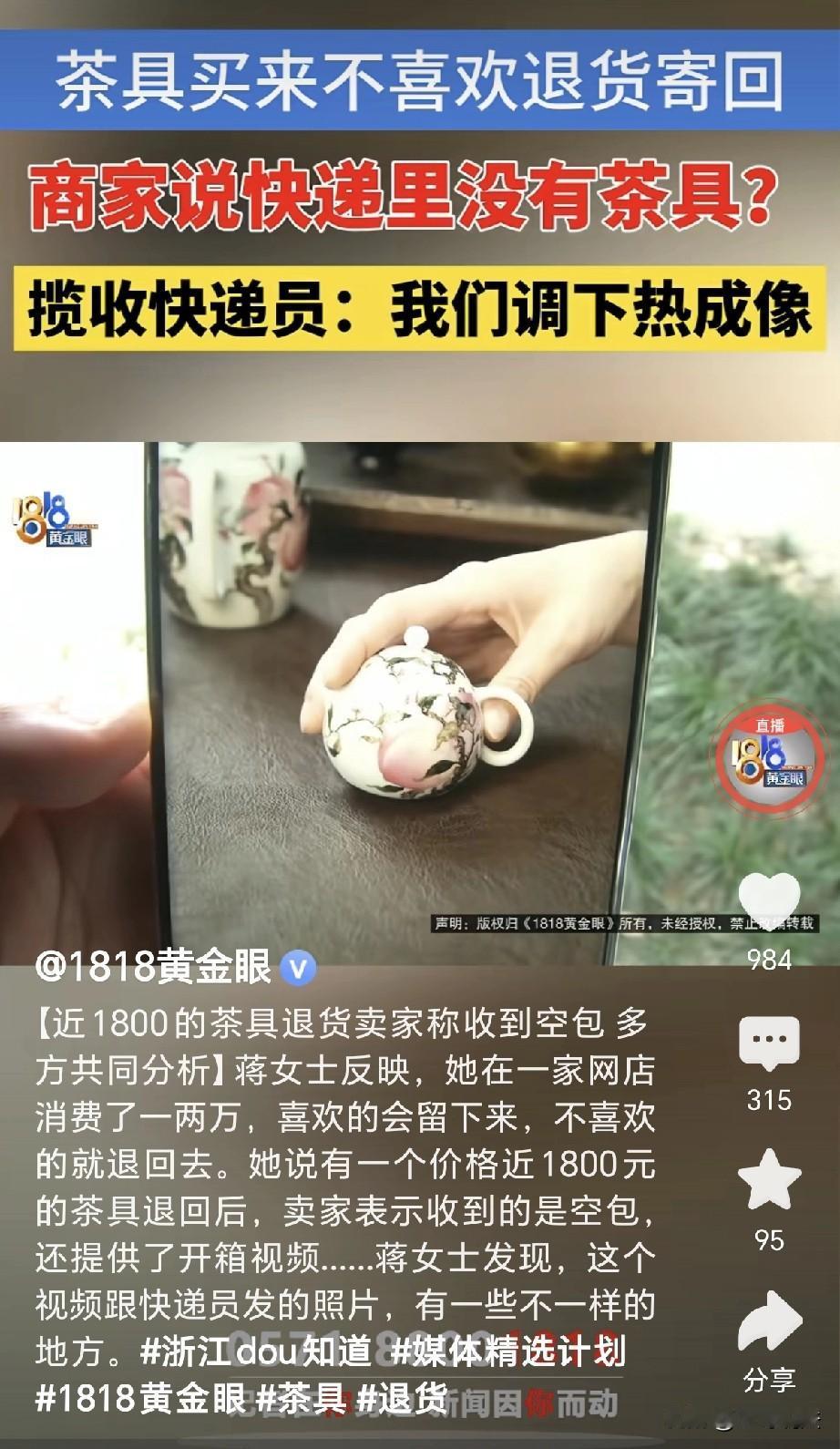 浙江杭州,一女子花1800元买了套茶具,可收到之后,发现茶具太小,女子要退货,她