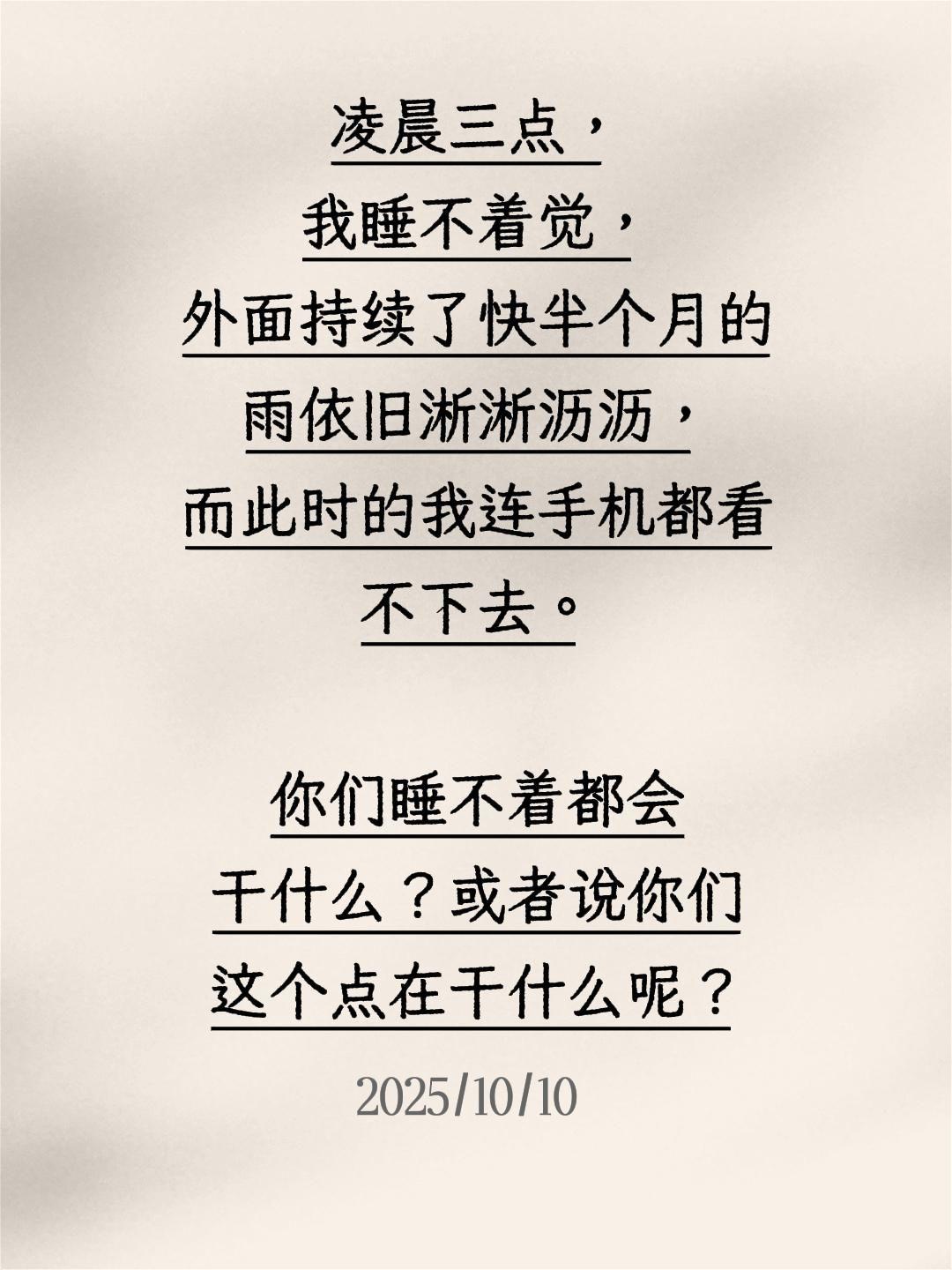 凌晨三点,我睡不着觉,外面持续了快半个月的雨依旧淅淅沥沥,而此时的我连手机都看不下去。 你们睡不着都会干什么?或者说你们这个点在干什么呢?