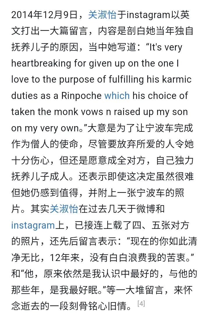 关淑怡一生为情所困。 晚年凄凉 十几年来生父对她们母子两个不管不问 据资料显示,关淑怡前男友宁波车让她在2001未婚先孕,但是不能和她结婚。 关淑怡为了成全爱人成为僧人的理想,愿意成全对方,独自养育孩子,默默承受一切。 可能压抑太久,也可能舆论太大对于孩子的生活一直是一个争议,她突然想宣告给大家孩子的生父是谁?期间也流露出生父对他们母子的不关心。 可能对这份儿情守护的太过于疲惫,才有一丝丝的抱怨吧! 为情所困的女人注定是悲惨的,她的晚年只有儿子和父亲的默默守护,重病在身,也没有得到她钟爱一生那个男人的一丝丝温暖,有点凄凉。