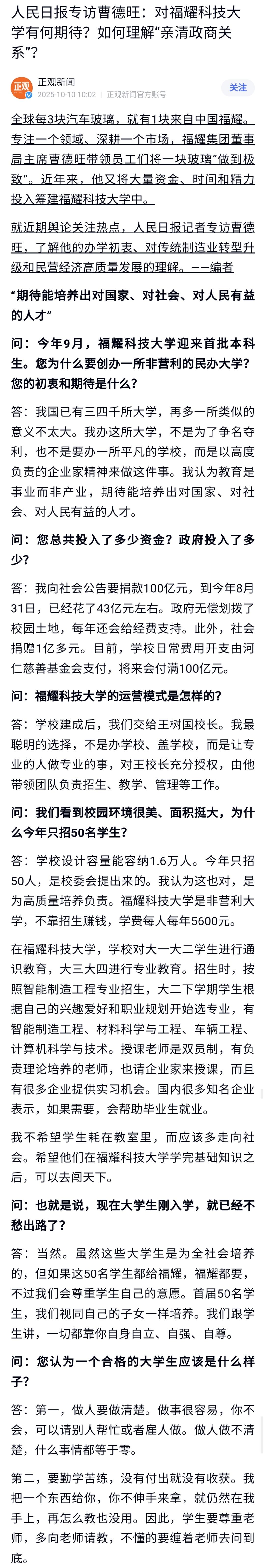 从这篇访谈可以了解到,福建福耀科技大学设计的学生规模为1.6万,除了曹德旺先生的