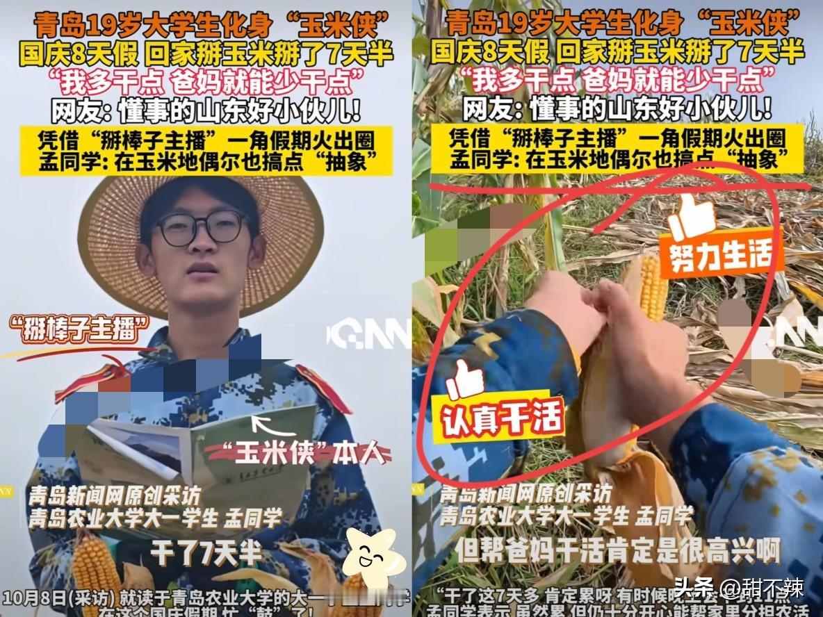 山东青岛农业大学的一名大一男生,趁着国庆放假8天回家,因为父母在街上摆摊卖水果,无法离开摊位,他倒好,带着俩同学扎进玉米地,足足干了7天半,把5亩地的玉米全收完了! 这活儿哪是“体验生活”啊?早上五点半就踩着没散的露水出门,兜里揣着妈妈蒸的白面馒头当午饭,玉米叶边缘的小刺刮得胳膊一道红印,他只把校服袖子往下拽拽,接着弯腰掰! 手心被玉米壳磨得发疼,摸片创可贴随便缠两圈就继续,就怕太阳晒蔫了玉米杆,后面更费劲! 同学来帮忙,没半小时就直不起腰,他还得笑着教“捏着底部拧一下就轻松”,递过自己的水壶让他们歇会儿,嘴里念叨“不急,别让我爸妈操心”! 最戳人的不是他多能扛,是他那句实在话:“我多干一点,爸妈就能少累一点。” 现在多少人把孝顺挂在“以后有钱了就好”的嘴上,他知道爸妈白天守水果摊、晚上惦记玉米地,所以宁愿把旅游计划放一放,用满手的茧子换爸妈能早点歇着! 各位读者你们怎么看?欢迎在评论区讨论!