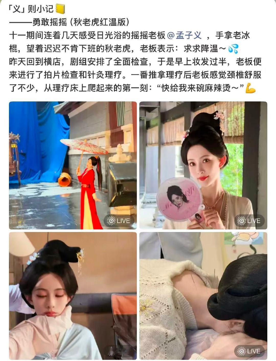 孟子义求横店降温孟子义理疗完第一件事是吃麻辣烫 10月10日,小助理发文分享的工作日常:「义」则小记📒
