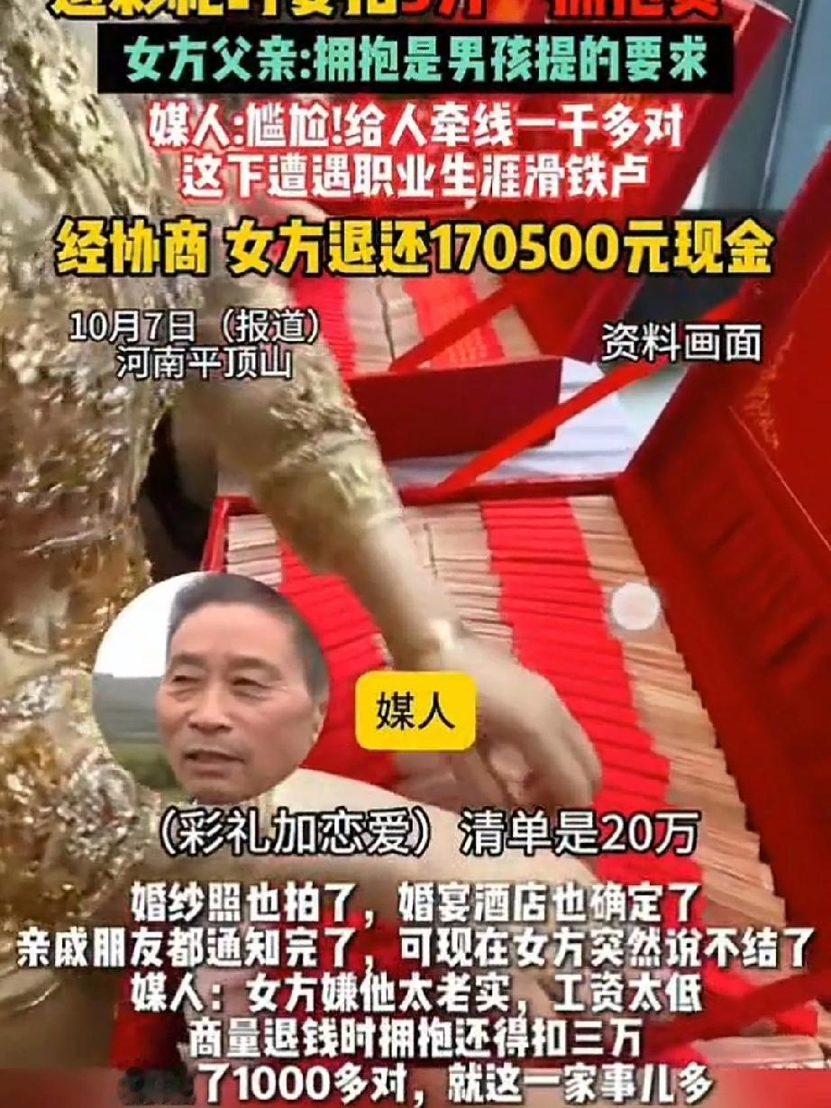 20万彩礼女方突然悔婚! 退彩礼时要扣3万“拥抱费”因为女方父亲说拥抱是男方提出来的,现在男方家结婚日期通知了亲戚朋友,结婚照也拍了婚宴酒店也订了,光等结婚这天了,女方一句嫌男友太老实工资低,这婚不想结了这是理由吗?不愿结婚早点提出来男方不至于损失这么多钱! 弄的男方脸面尽失,亲戚朋友都知道了,把结婚准备的酒席都退了,还给扣除3万拥抱费退回170500的彩礼,婚没结成还赔了好几万,这男方父母闹心吧?