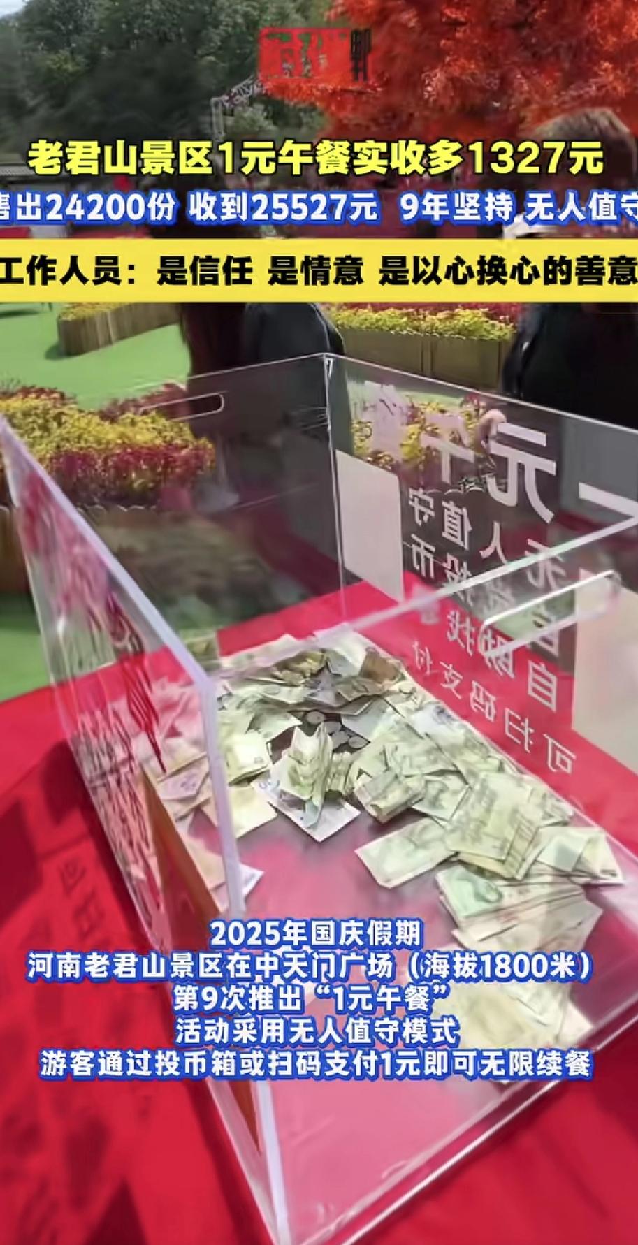 河南老君山景区又现暖心一幕!国庆期间,他们第九年推出“1元午餐”,在海拔1800米处为游客提供热乎饭菜,无人看守,全凭自觉。 结果今年卖出24200份,竟收到25527元,多出了1327元!工作人员感动地说:多出的不是钱,是信任和情意。 这份以心换心的善意,成了假期里最温暖的风景。九年坚持,见证了人与人之间最朴素的诚信。