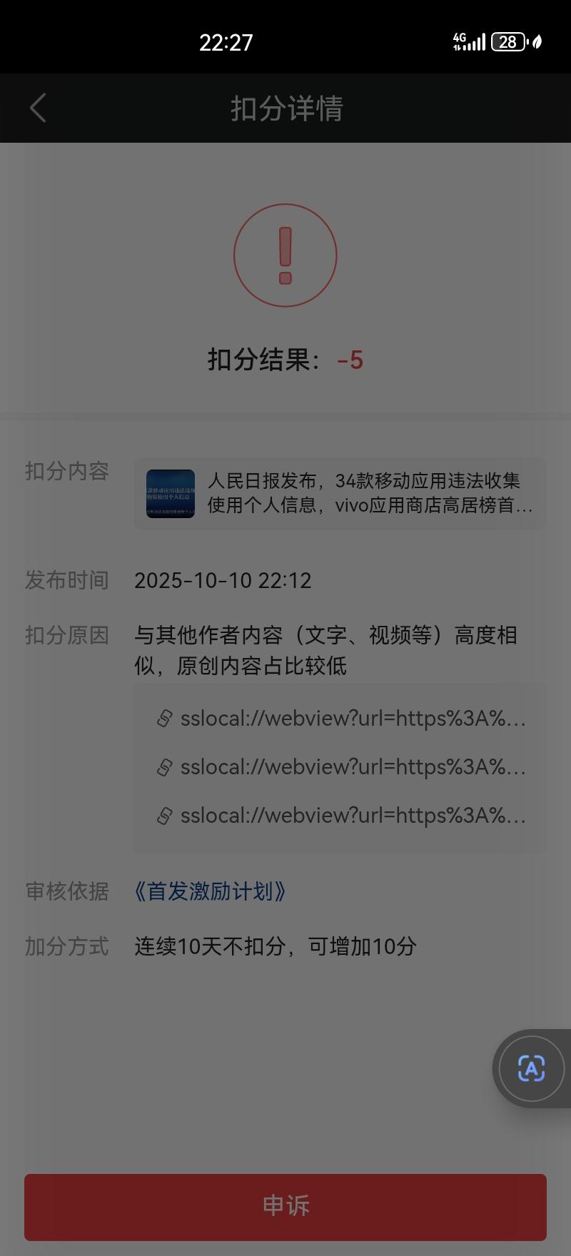 深夜EMO[流泪],本来想好好写两篇睡觉。结果这下彻底睡不着了。发一篇限流,不能被分享(图一),发一篇被通知内容非原创(图二) 我和他们真的不一样啊@头条号 ,(图三,图四)他们是按违规分类,我是按手机商城分类。 惨,惨,惨! 一天天,没阅读,没展现,还被扣分。 蚊子还欺负我(图五) 救救我吧。