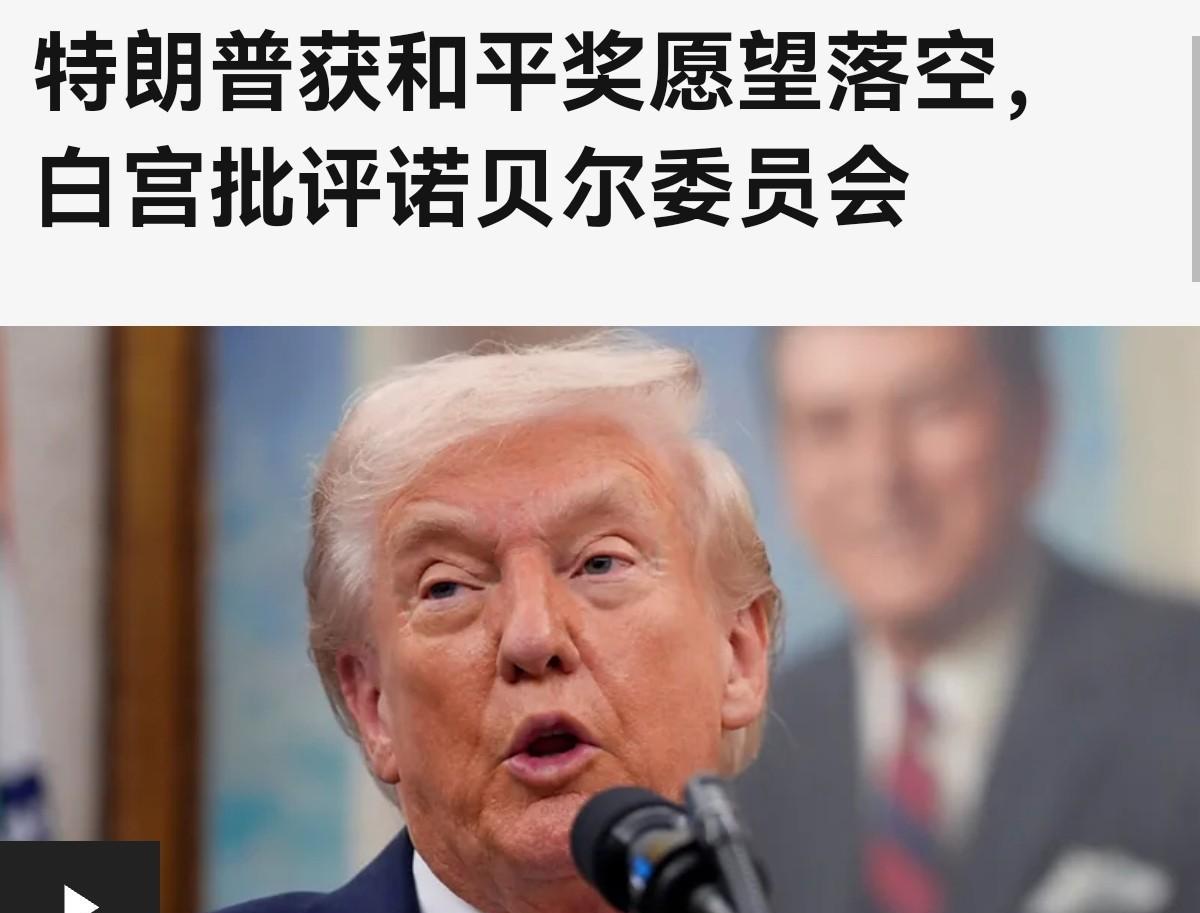 但,诺贝尔委员会证明他们把政治置于和平之上。很显然,美国的这一表态,明显是对诺贝尔委员会在施压。说实话,特朗普可能是美国历史上第一个厚着脸皮伸手找诺贝尔委员会要和平奖的美国总统,这种借助美国霸权伸手要奖的行为,这才是真正的把政治置于和平之上。如果特朗普不是美国总统,美国白宫要专门就此事发声吗? 别忘了,特朗普曾公开威胁加拿大,要将加拿大变成美国的51个州,并觊觎丹麦的格陵兰岛,并对伊朗实施了轰炸。这样的人,有什么资格获得诺贝尔和平奖。而事实上,特朗普虽然没有发动大规模的热战,但是特朗普发动了一场针对全球各国的关税战。世界因为特朗普变得更加的充满敌意和撕裂。特朗普当然没有资格获此奖项!