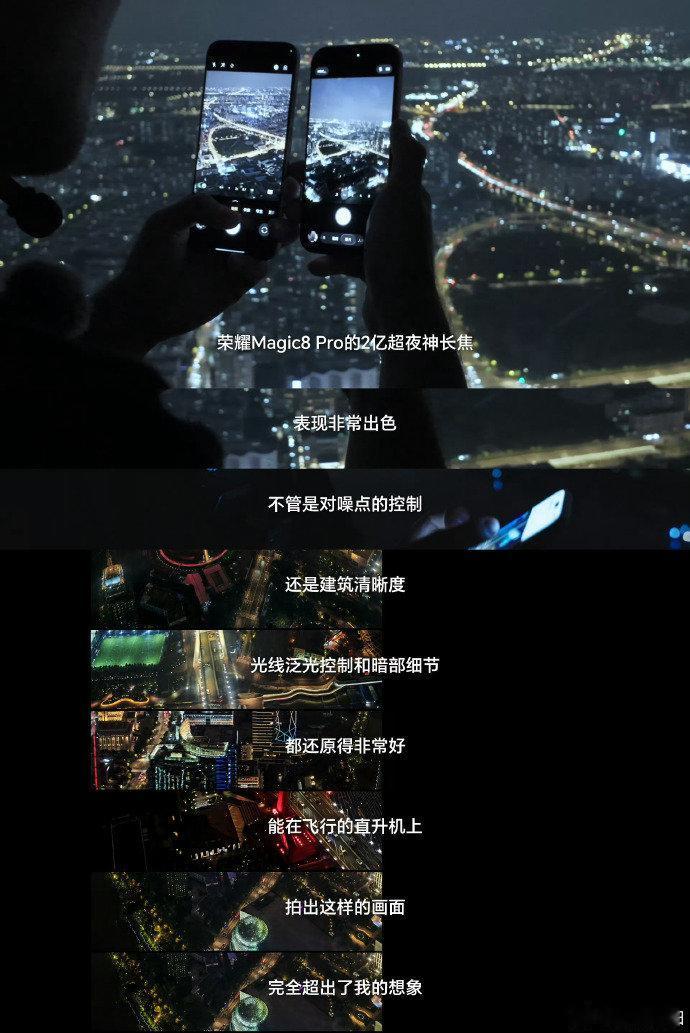 直升机航拍夜景稳的一比,荣耀Magic8系列真夜神是站稳了,画质直接把iPhone17 Pro都比下去了。 荣耀这次真的支棱起来了!夜景模式稳如泰山,出片率超高,照片质感细腻。无论是城市灯火还是自然星空,随手一拍就是大片。这次荣耀拍照实力跃升第一梯队,名副其实的“超夜神”!欢迎友商来对比,不服来战!