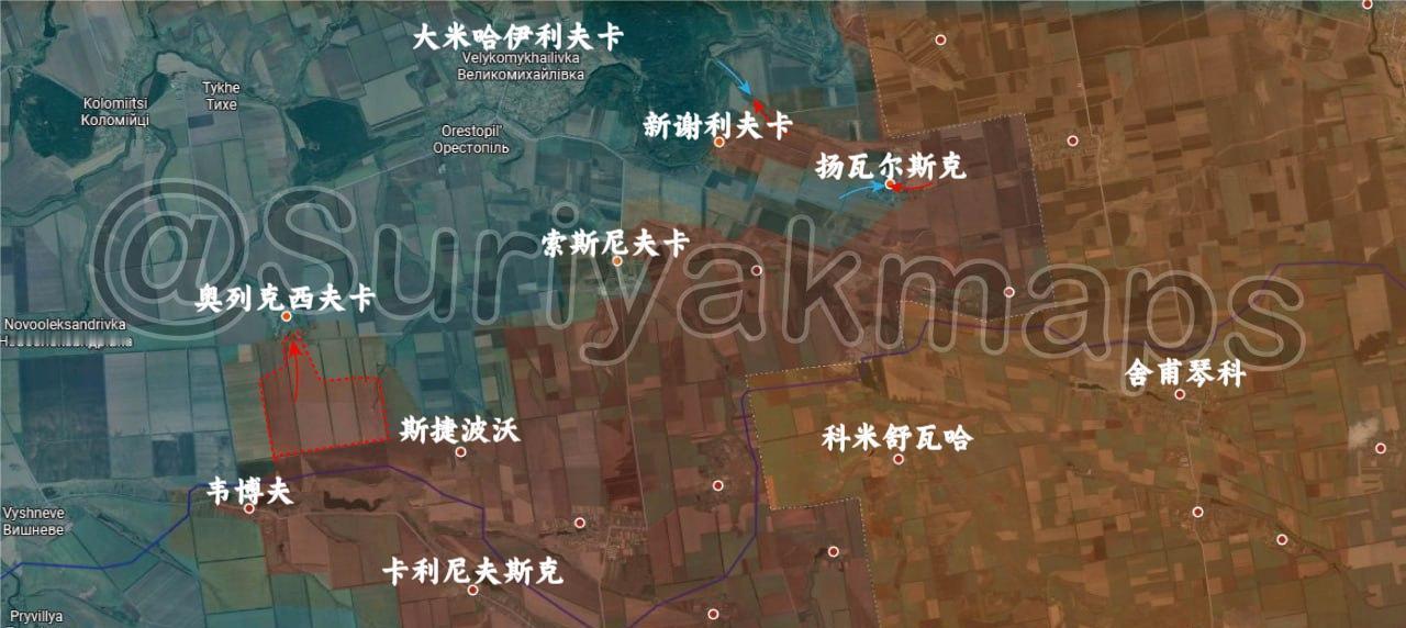 乌苏更新10.9俄乌战场最新局势 1、苏梅:乌克兰军队继续向奥列克西伊夫卡推进,并控制了该村以西的仓库。另一方面,俄军收复了湖区南部一些失地。 2、红利曼:俄罗斯军队继续在亚姆比尔内部推进,控制了墓地。 3、红军村:俄军开始向诺沃帕夫利夫卡西郊发起进攻。 4、大米哈伊利夫卡:俄军巩固了最近在奥列克西夫卡以南夺取的阵地。此外,俄军与乌克兰军队在新谢利夫卡和扬瓦尔斯克的战斗仍在继续。 来源:Suriyakmaps