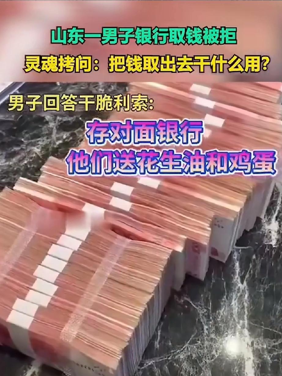 山东一男子取钱被拒,质问几次取钱干什么用?几十万一下从银行取光损失不少吧?这名男子给了银行一个最充足的理由:俺取出来存到对面银行,他们送花生油和鸡蛋,男子的回答让银行职员哑口无言!无奈的把钱取出来给了男子! 对于这些百姓来说 自己的钱存取是个人的权力,银行职员无许过问吧!