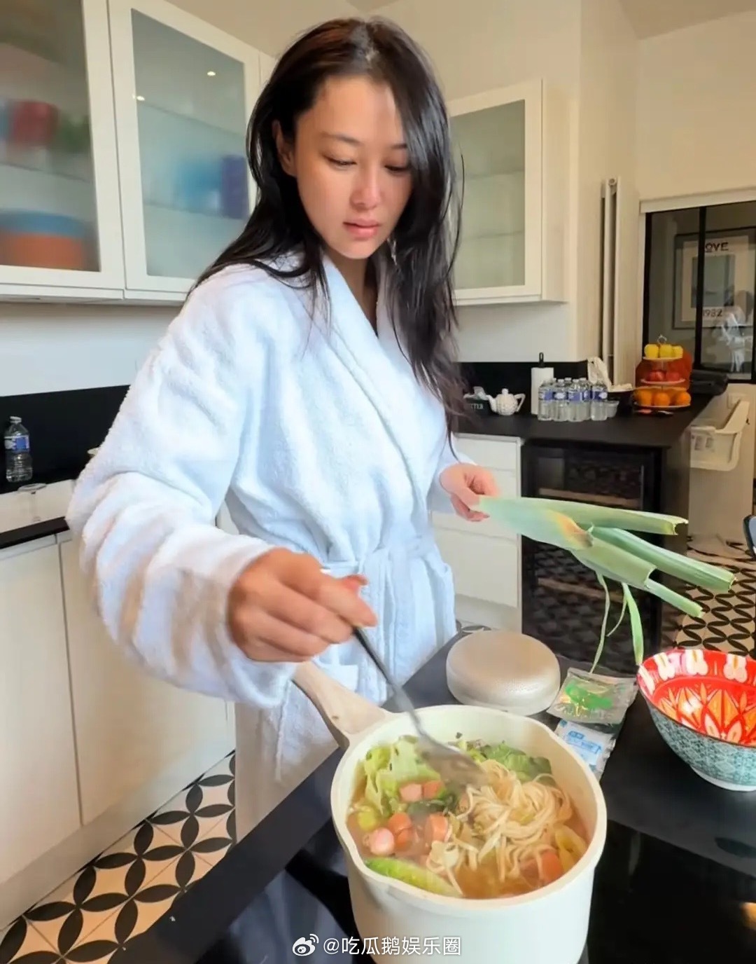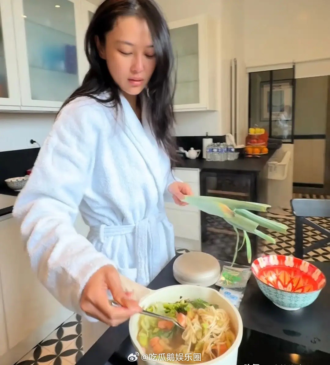 张馨予早起开工,素颜穿着睡袍+拖鞋在厨房刷牙,从家里带了一只小电锅,早饭给自己煮一锅青菜火腿肠挂面,活得非常接地气,真实不做作又漂亮的女艺人,可是太难得了。 ​​​