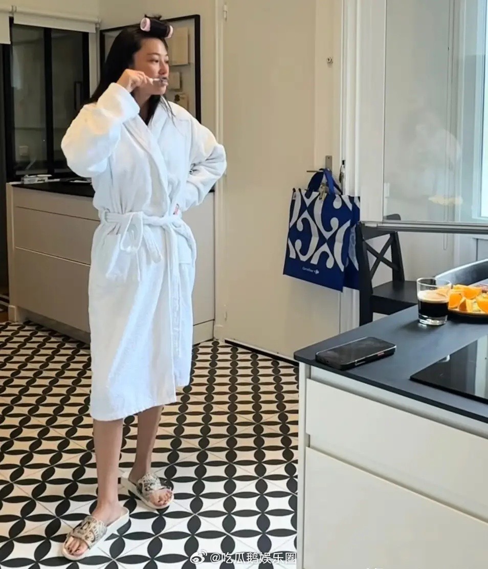 张馨予早起开工,素颜穿着睡袍+拖鞋在厨房刷牙,从家里带了一只小电锅,早饭给自己煮