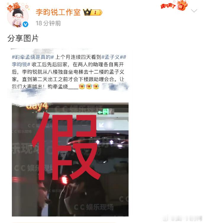 昀牵孟绕被打假 孟子义、李昀锐工作室分别对昀牵孟绕是真的打假,不管怎样两个人友情很好是真的!