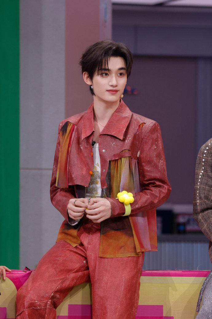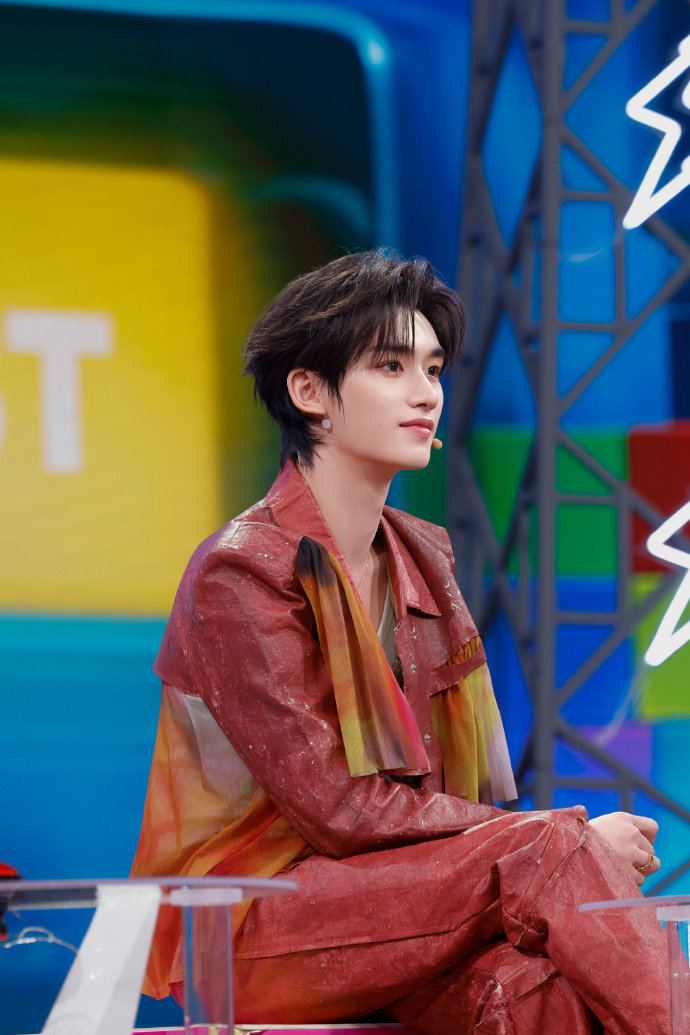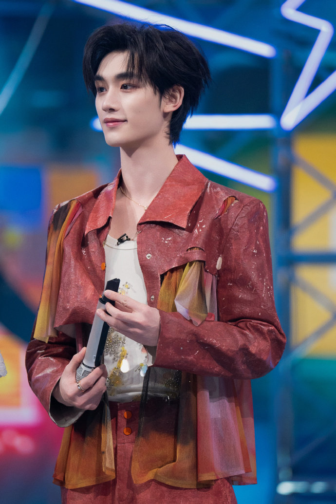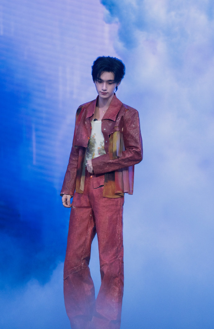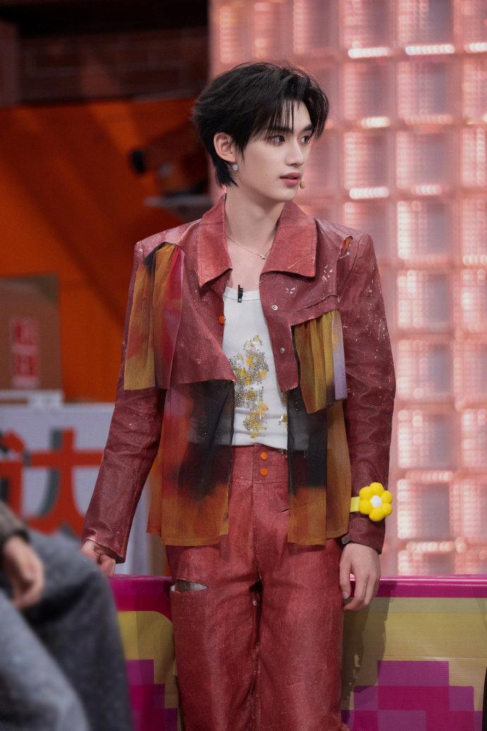 丁程鑫好六门担,丁程鑫红棕皮衣look,期待住今晚和我们小丁的舞台见面啦~