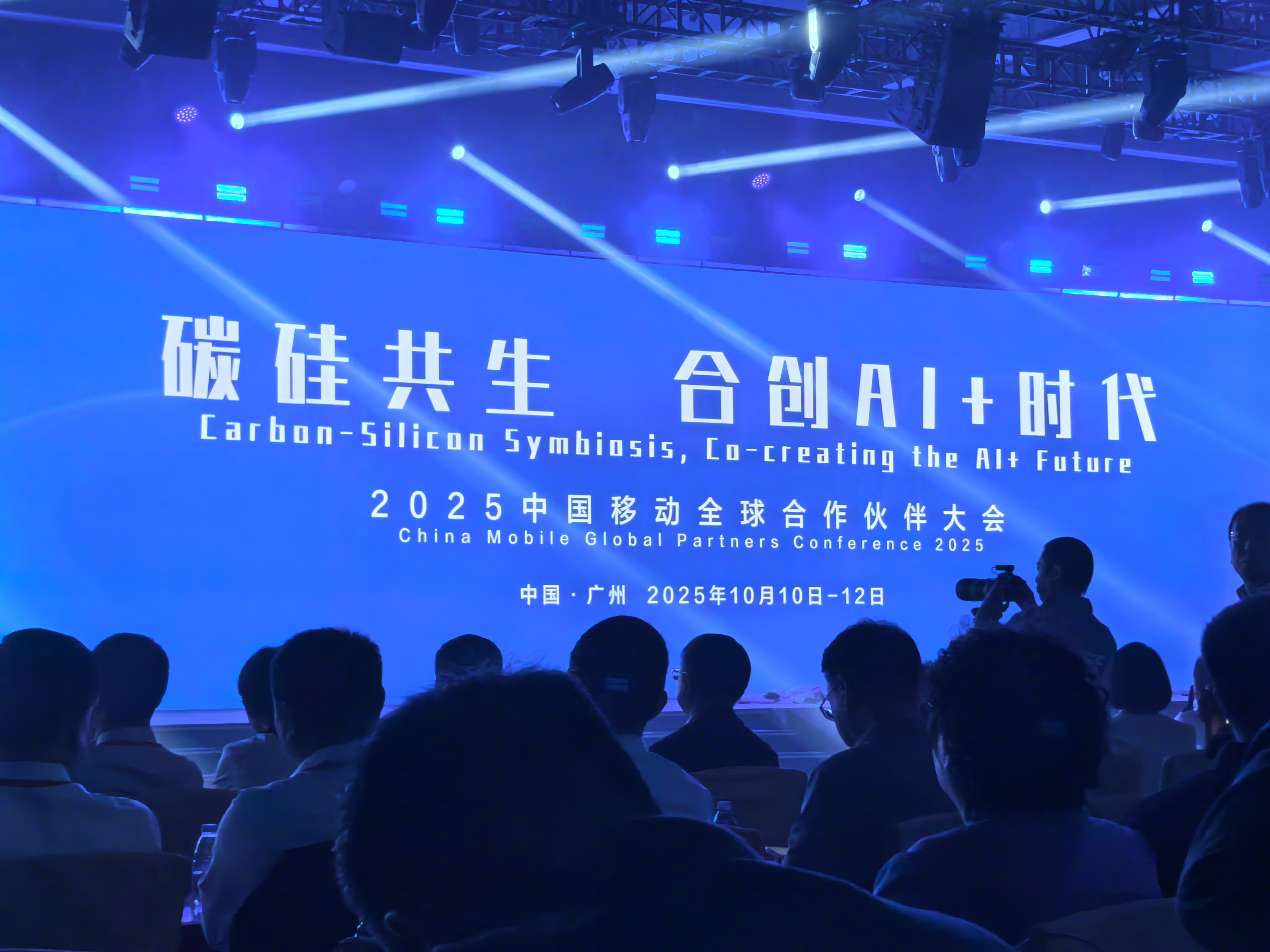 2025中国移动全球合作伙伴大会 正在2025中国移动全球合作伙伴大会主会场,主题是《碳硅共生 合创AI+时代》。